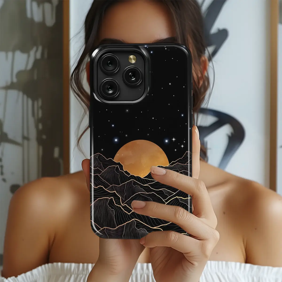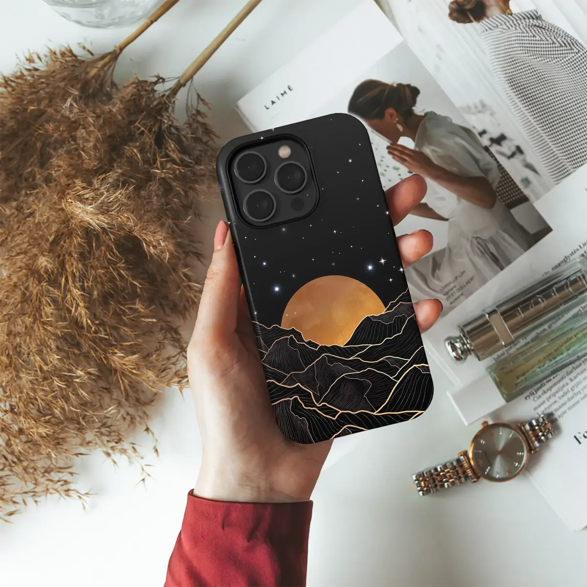 Capture the magic of a celestial night with this elegant design. It features a large, textured golden moon rising over a stylized mountain range, all set against a deep black, star-filled sky. The mountains are intricately detailed with flowing gold line art, creating a sophisticated and mystical landscape that adds a touch of modern artistry to your everyday life.