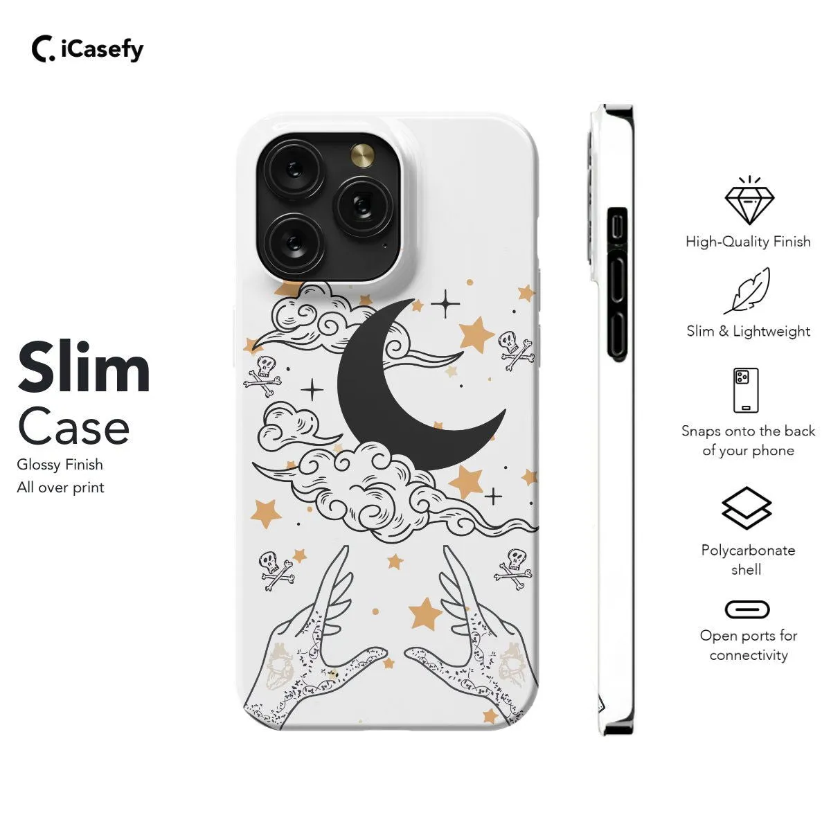Illuminate your device with celestial charm and mystical energy with this captivating phone case featuring a celestial moon, stars, and hands intertwined in an astrological dance. This accessory exudes a sense of cosmic connection and spiritual harmony, inviting contemplation of the universe and the interconnectedness of all things. Carry a touch of celestial wisdom with you wherever you go, letting your device become a conduit for cosmic inspiration with this mesmerizing and thought-provoking case.