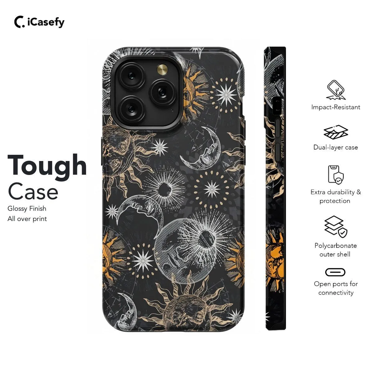 Introducing our Celestial Moon Stars Night Sun phone case, capturing the mystical beauty of the cosmos. With an enchanting blend of moon, stars, and sun motifs, this case adds celestial elegance to your device. Embrace the wonder of the universe while protecting your phone in style.