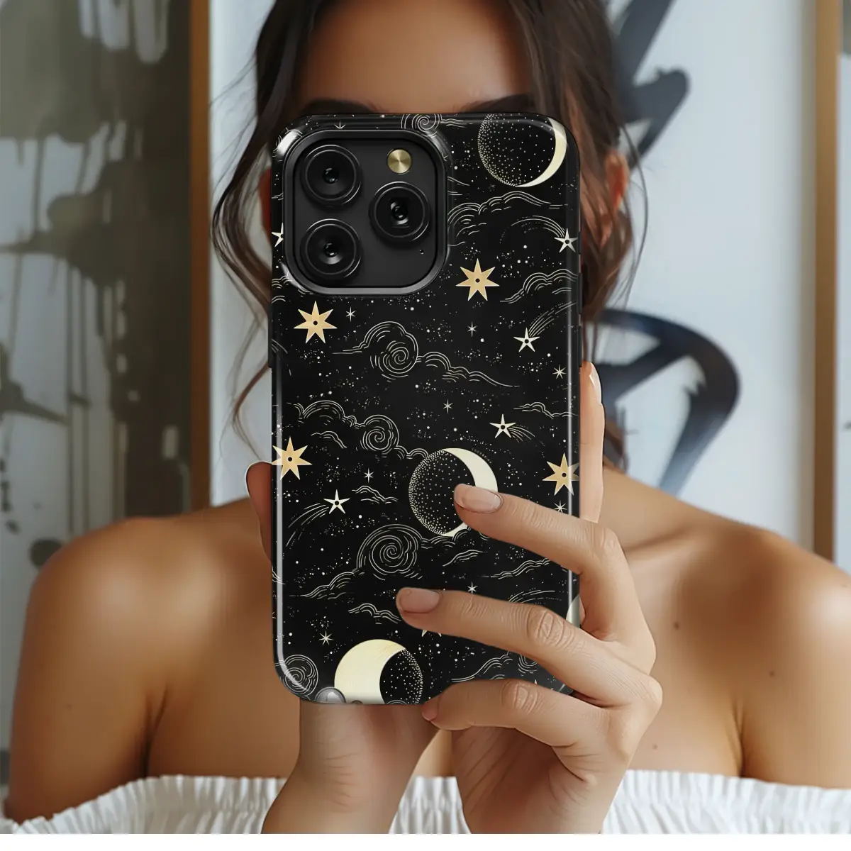 Embrace the magic of the cosmos with this enchanting celestial pattern. Set against a deep black backdrop, this design features a dreamy night sky filled with intricate crescent moons, twinkling stars, and swirling stylized clouds. The gold and cream illustrations give it a vintage, mystical feel, perfect for anyone who loves astrology, witchy aesthetics, or the beauty of the starry expanse above.