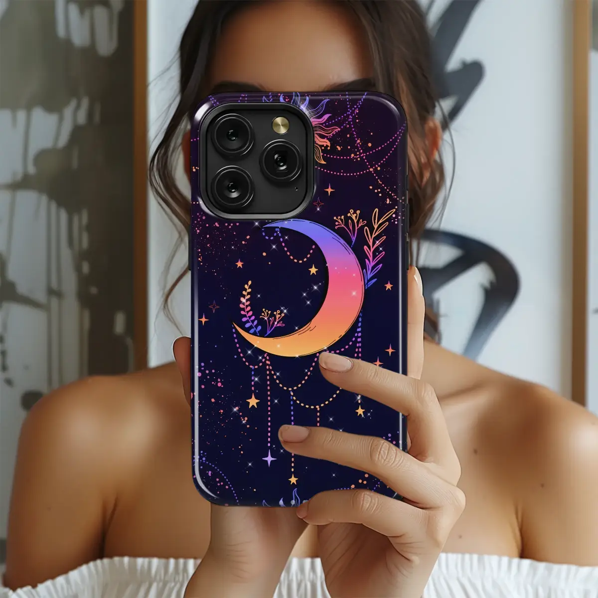 Embrace the magic of the cosmos with this stunning celestial design. Set against a deep, starry night sky, a beautiful crescent moon transitions from mystical purple to a warm orange glow, adorned with delicate botanicals and hanging beaded chains. Above, a stylized sun radiates with a matching colorful gradient, surrounded by sparkling stars to create an enchanting and bohemian aesthetic.
