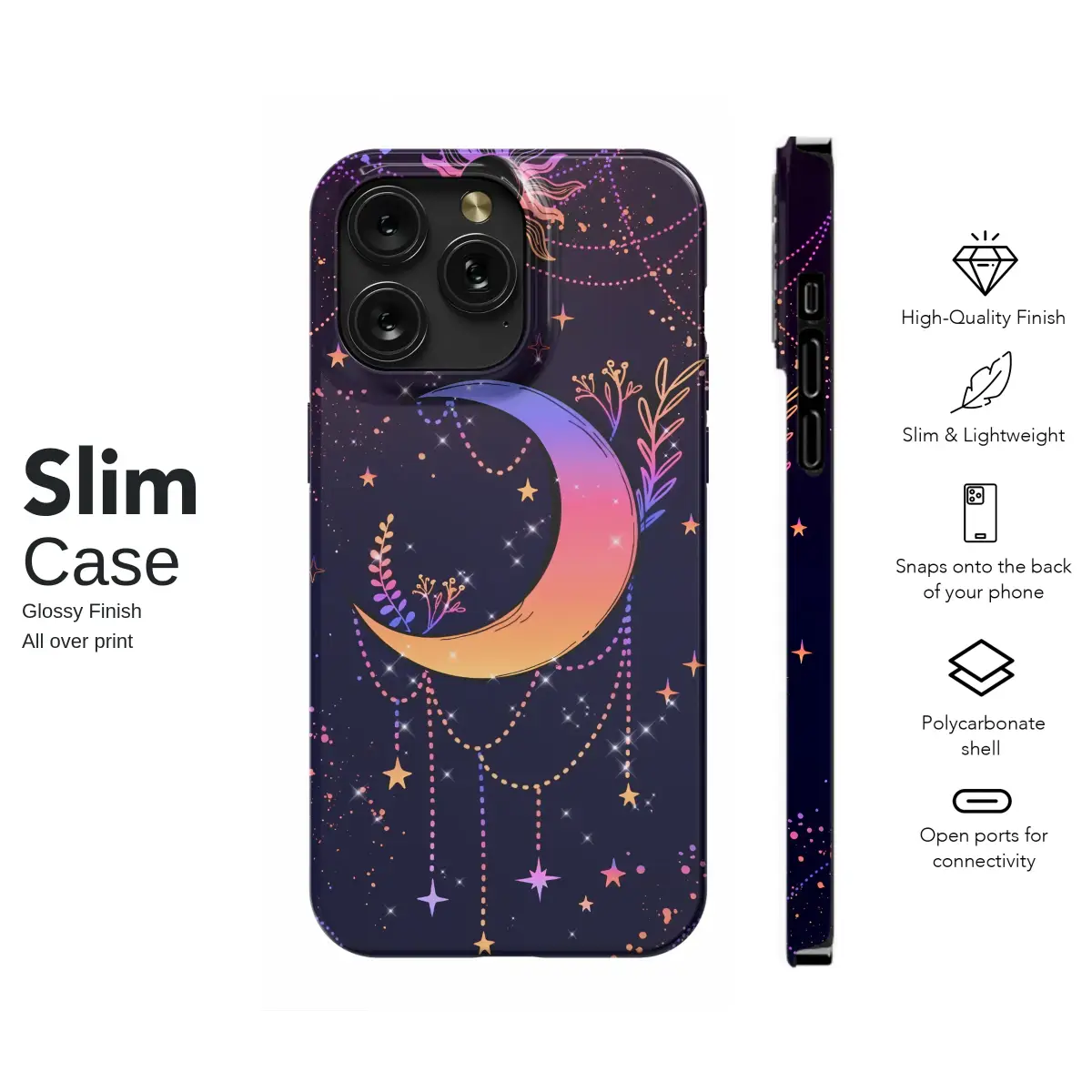Embrace the magic of the cosmos with this stunning celestial design. Set against a deep, starry night sky, a beautiful crescent moon transitions from mystical purple to a warm orange glow, adorned with delicate botanicals and hanging beaded chains. Above, a stylized sun radiates with a matching colorful gradient, surrounded by sparkling stars to create an enchanting and bohemian aesthetic.