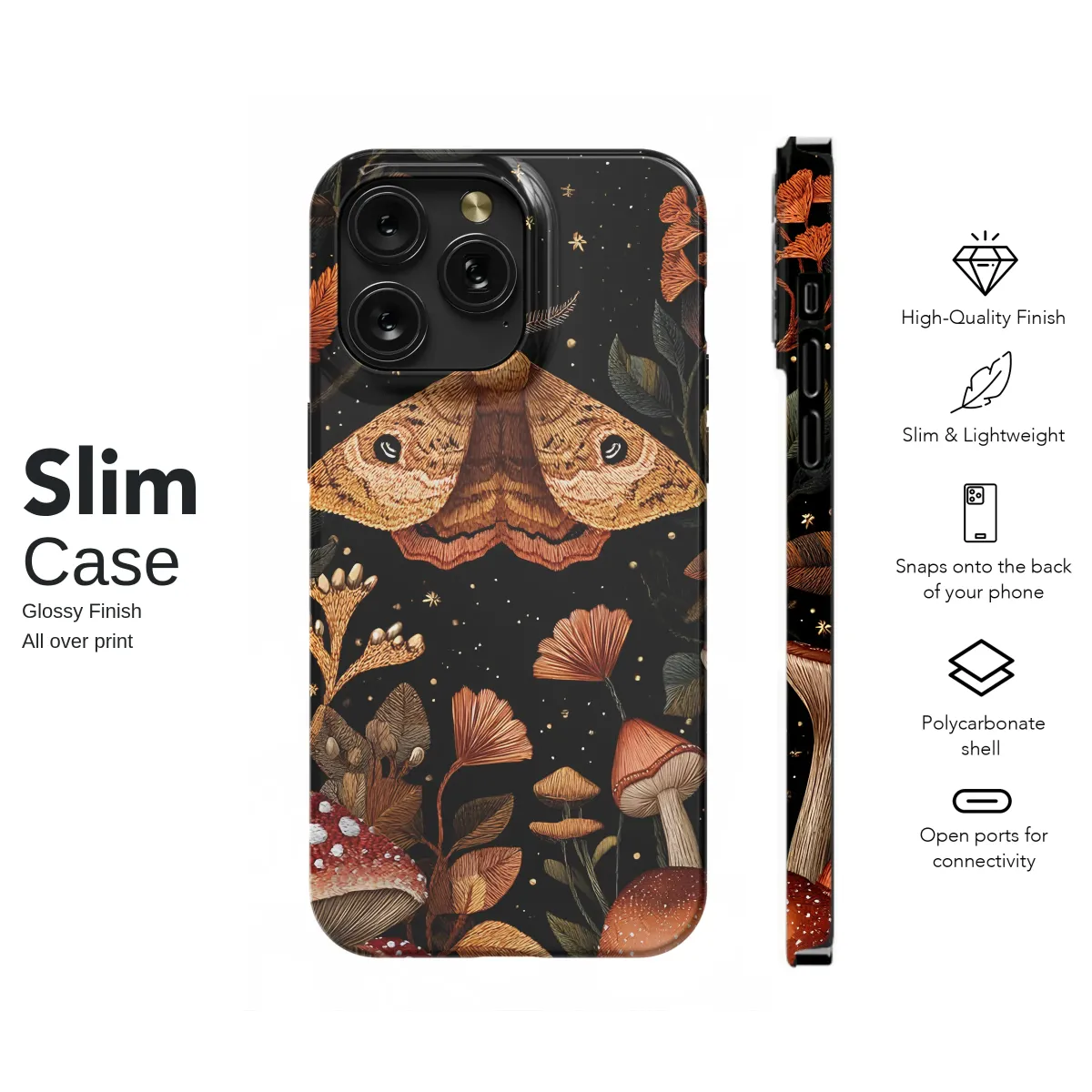 Step into a moonlit forest clearing where magic feels real. This enchanting design captures a breathtaking moment under a star-dusted sky, featuring a magnificent, intricately detailed moth as its celestial centerpiece. Its wings, rendered in warm autumnal tones of amber, rust, and gold, appear as if meticulously stitched from moonlight itself, creating a stunning faux embroidery effect. Surrounding this mystical creature is a lush tapestry of woodland wonders: whimsical toadstools, including the iconic red-capped fly agaric, sprout from the rich, dark earth, while delicate botanicals and glowing leaves weave through the scene. The deep, velvety black background makes the warm, earthy colors pop, creating a stunning contrast that evokes a sense of cozy mystery and natural wonder. This artwork is perfect for lovers of cottagecore aesthetics, dark academia vibes, and anyone who finds beauty in the quiet magic of the nocturnal world. Carry a piece of this enchanted forest with you and let its whimsical, witchy charm inspire a sense of awe and connection to nature's hidden secrets. It’s an ideal gift for the modern mystic, the nature lover, or the dreamer who sees the extraordinary in the everyday. Adorn your favorite accessory with this slice of midnight magic and let your style tell a story of folklore and fantasy.