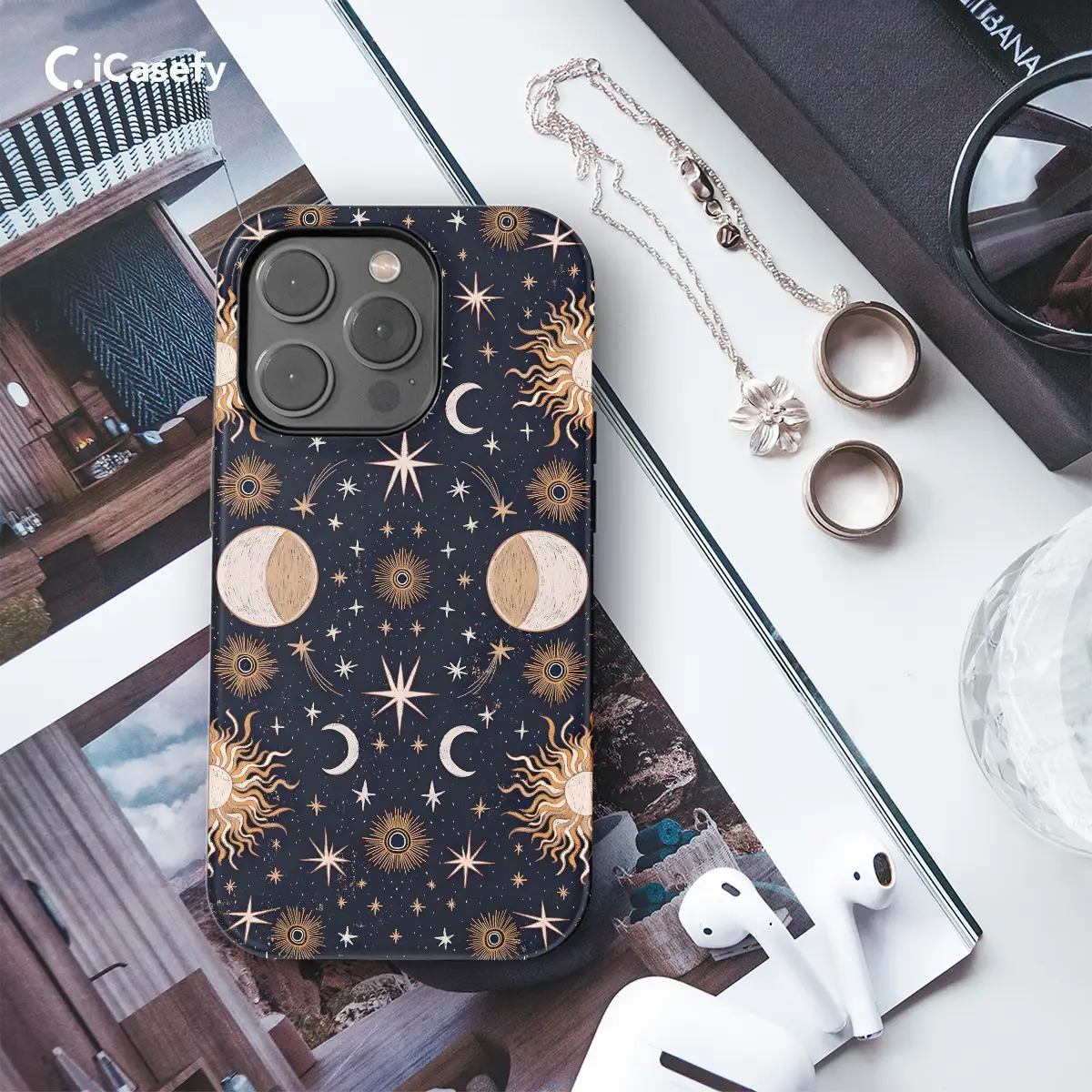 Embrace the celestial grandeur with our captivating phone case, adorned with a mesmerizing cosmic tapestry of moon, stars, and sun. Immerse yourself in a captivating night sky, where ethereal orbs illuminate your device in enchanting glory. Crafted with precision, this case provides unparalleled protection for your phone, ensuring its celestial beauty shines through every day and night.
