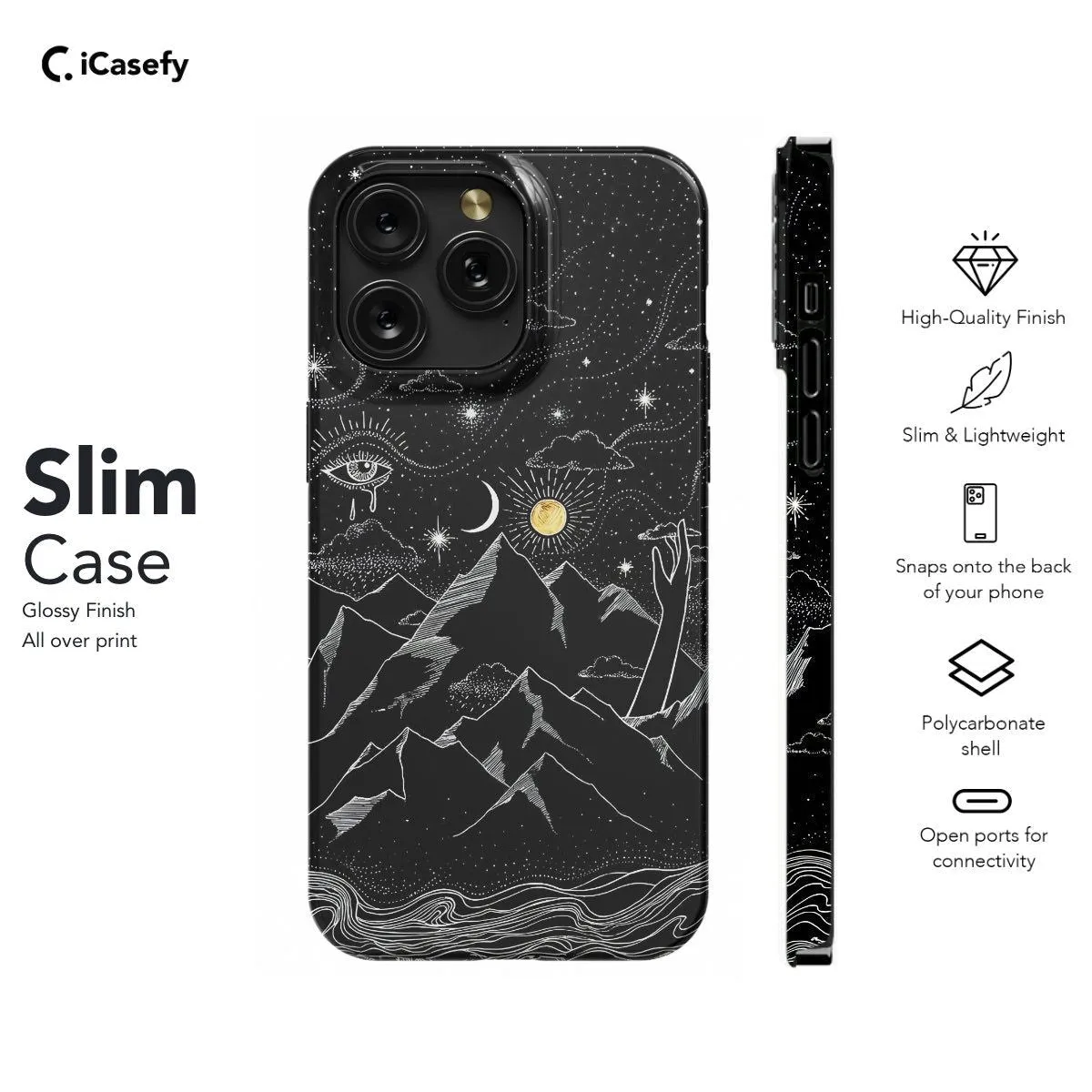 Immerse yourself in the celestial wonders of the night sky with this captivating phone case featuring a serene scene of the moon, mountains, and drifting clouds. Inspired by the tranquil beauty of the cosmos, this case invites you to embrace the mystique of the night and the majesty of nature's grandeur. Carry the enchantment of the celestial realm with you wherever you go and let your device become a portal to dreamy celestial landscapes.