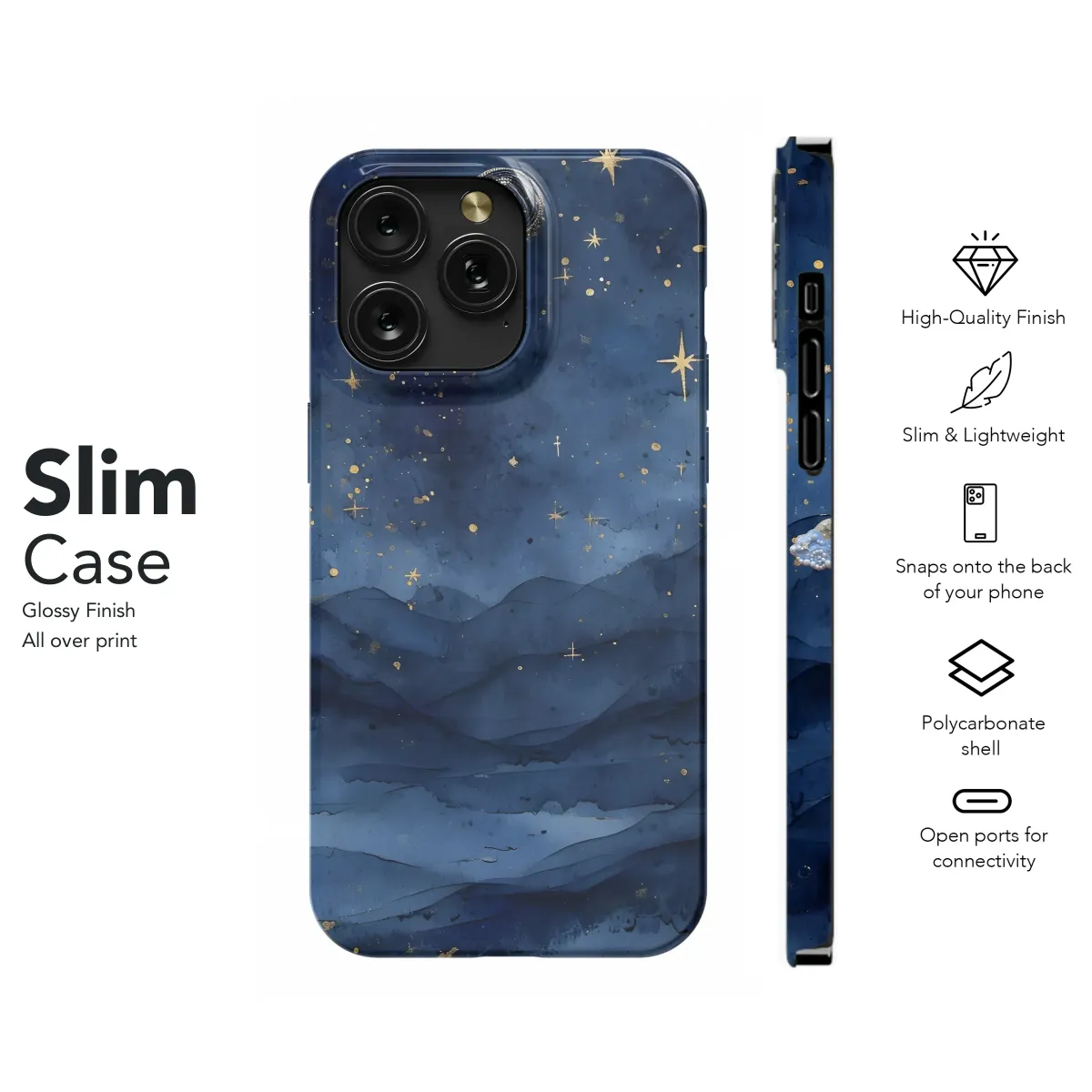 Embrace the celestial magic with this dreamy design, featuring a captivating watercolor nightscape. Deep indigo hues blend seamlessly to create a breathtaking mountainous landscape under a sky teeming with glittering gold stars and a crescent moon adorned with delicate beading. A shooting star streaks across the heavens, adding a touch of whimsical wonder. This enchanting artwork is perfect for those who appreciate beauty, serenity, and a touch of celestial mystique. Transform your everyday device into a piece of wearable art, reflecting your unique style and love for all things cosmic. The high-quality print ensures vibrant colors and lasting durability, while the design's subtle elegance makes it a sophisticated yet eye-catching accessory. Elevate your aesthetic and carry the starry night with you wherever you go. This design offers a sophisticated and stylish way to personalize your device, making it stand out from the crowd. This unique piece speaks to a love for the cosmos, adding a touch of celestial wonder to your life. Perfect for stargazers, dreamers, and anyone who appreciates the beauty of the night sky. Secure yours today and let your device reflect the magic within.