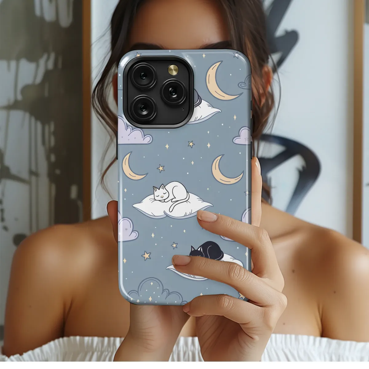 Drift into a celestial dreamscape with our "Cloud Kitties" design, a whimsical illustration that wraps your most essential daily companion in cozy, starlit magic. Imagine a serene night sky, painted in a dusty twilight blue, where gentle kittens—a mysterious black cat, a soft grey, and a pure white—are caught in the sweetest slumber atop fluffy cloud pillows. Golden crescent moons and twinkling stars dot the heavens, creating a peaceful, dream-like pattern that soothes the soul. This charming artwork is perfect for the cat lover, the dreamer, and the stargazer, offering a little slice of cottagecore fantasy and celestial wonder every time you reach into your pocket. It's more than just beautiful art; it's a protective talisman that guards your connection to the world, a daily reminder to find moments of quiet and peace. An ideal gift for a cat mom or anyone who adores a kawaii, witchy aesthetic, this piece transforms your tech into a personal treasure, enveloping it in a cozy embrace of moonlight and purrs. Let this serene scene bring a touch of calm and magic to your everyday hustle.