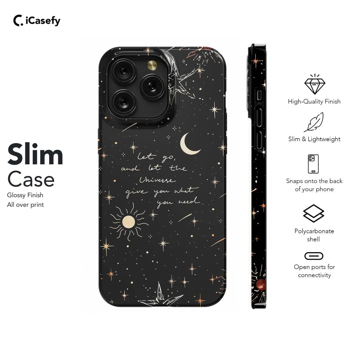 Illuminate your device with celestial allure with this captivating phone case featuring a dark moon and stars alongside an enigmatic quote. This accessory exudes a mystical charm, inviting contemplation of the cosmos and the mysteries of the night sky. Carry a touch of cosmic wisdom with you wherever you go, letting your device become a beacon of celestial inspiration with this mesmerizing and thought-provoking case.