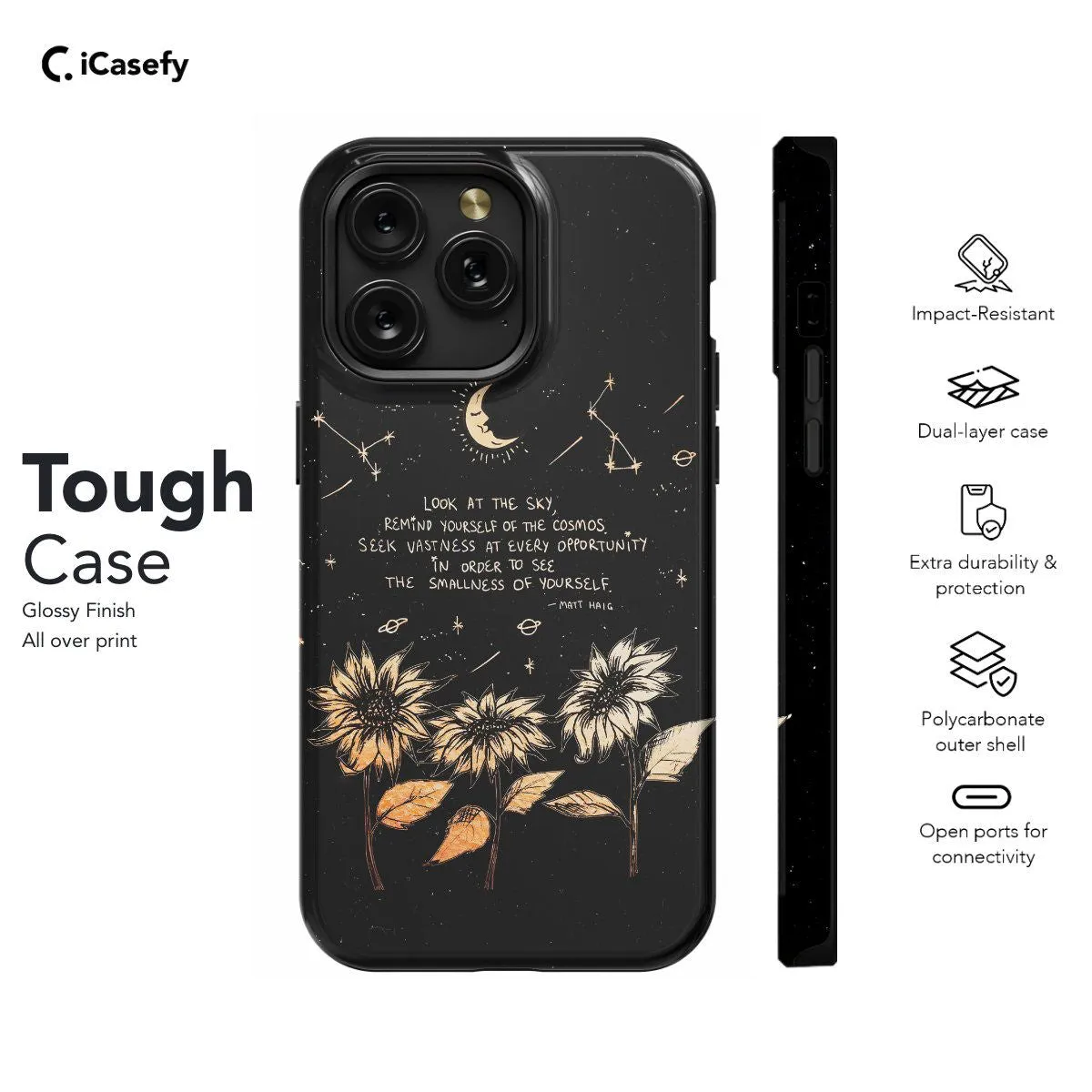 Embrace the celestial beauty and wisdom with this enchanting phone case featuring a sunflower, moon, and a celestial quote inspired by astrology. Let the sunflower symbolize vitality and the moon symbolize intuition, while the celestial quote adds a touch of cosmic insight. Carry the magic of astrology with you wherever you go and let your device become a symbol of cosmic connection and spiritual enlightenment with this charming accessory.