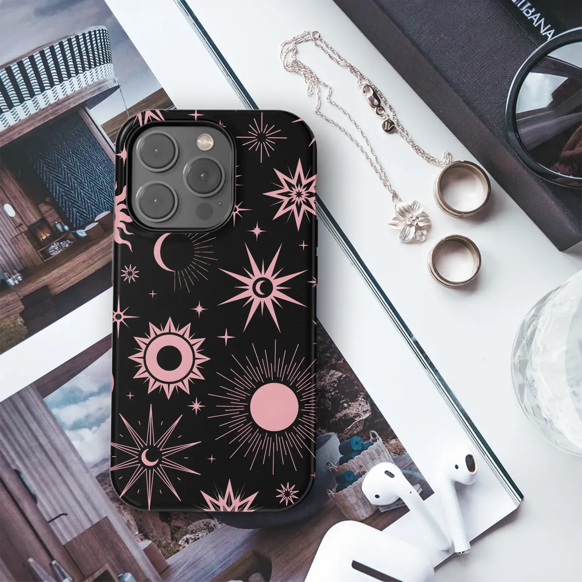 Adorn your most essential daily companion with the mystical allure of the cosmos with this stunning celestial accessory. Set against a deep, infinite black backdrop, an intricate pattern of dusty rose suns, moons, and stars creates a mesmerizing celestial dance. This design is rich with esoteric symbolism, featuring radiant sunbursts, serene crescent moons, and twinkling star formations that evoke a sense of ancient magic and astrological wonder. It's the perfect statement piece for the modern witch, the spiritual soul, or anyone who finds beauty in the night sky and the universe's mysteries. This stylish and durable shell not only adds a touch of bohemian, witchy elegance to your look but also provides a vital layer of safeguarding for your technology, keeping it safe from the rigors of your daily adventures. Elevate your personal style and express your inner magic with this unique piece that feels like a personal talisman. It makes a wonderfully unique and thoughtful gift for any astrology lover, spiritual seeker, or fan of dark academia and gothic aesthetics. Let this sacred geometry and cosmic art be a constant reminder of the magic that surrounds us, transforming your everyday gadget into a beautiful work of art that truly reflects your spirit. Carry the universe in your hand and let your personal style shine as brightly as the constellations.