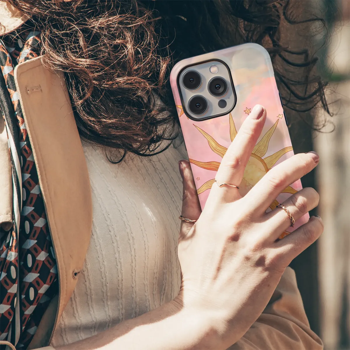 This enchanting celestial art print evokes a sense of whimsy and wonder, featuring a radiant sun surrounded by shimmering stars against a dreamlike pastel sky. The soft hues of pink, peach, and gold create a calming and ethereal aesthetic, perfect for adding a touch of magic to your everyday essentials. Ideal for those who adore astrology, bohemian decor, or simply appreciate the beauty of the cosmos, this design brings a touch of celestial charm to your tech accessories. Let this artwork transport you to a dreamy world of sunshine and stars every time you reach for your device. This unique and eye-catching image makes a thoughtful gift for star lovers, astrology enthusiasts, or anyone seeking a touch of celestial inspiration in their daily life. Embrace the magic and let your inner light shine with this captivating sun and stars design; perfect for trendy individuals looking for unique, aesthetic, and celestial inspired styles.