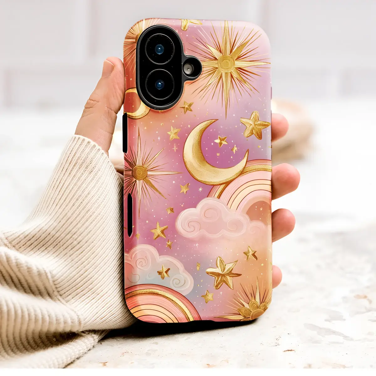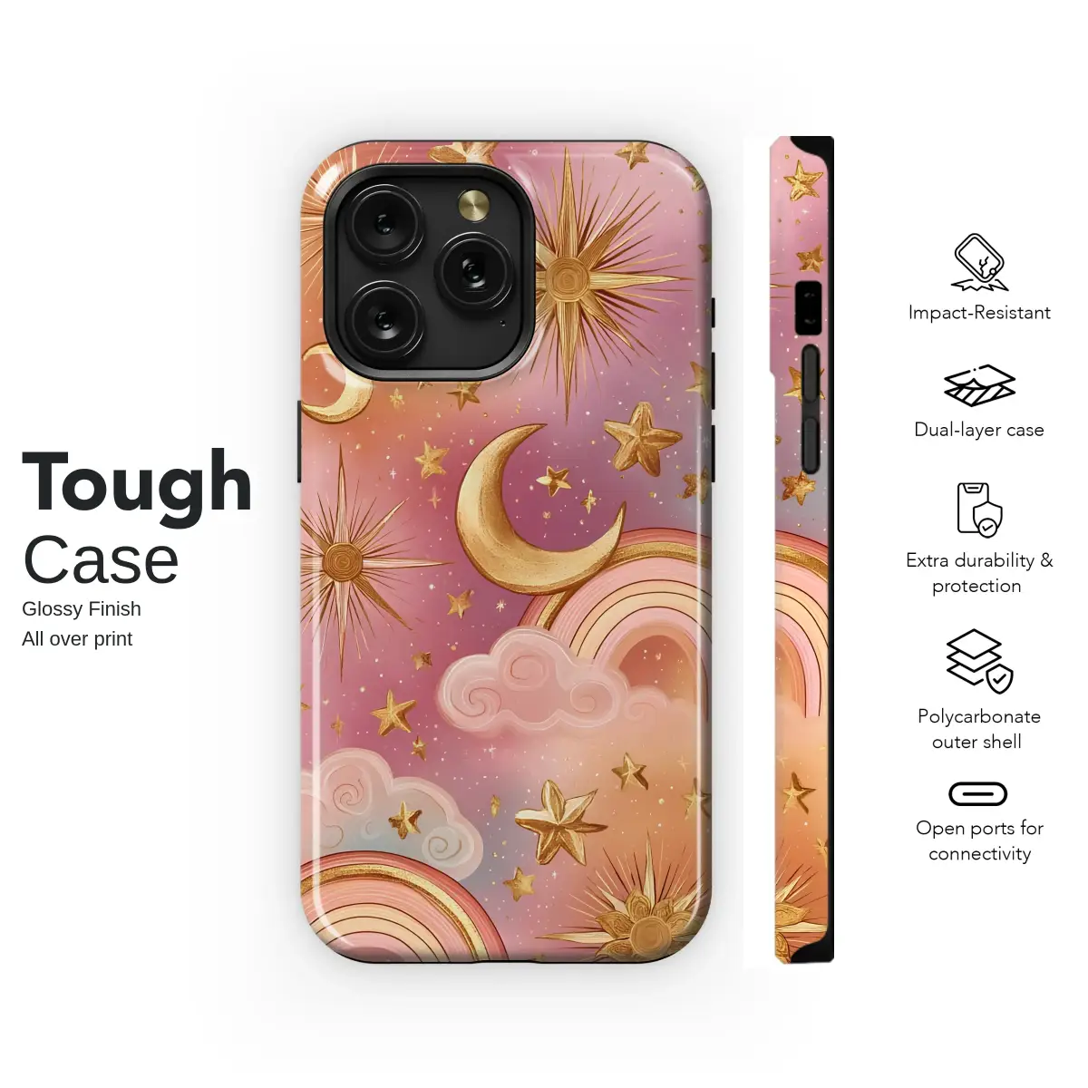 Adorn your accessory with a touch of magic. This celestial design captures a dreamy, whimsical sky filled with shimmering gold moons, stars, and suns. Set against a beautiful pastel gradient of pink, purple, and orange, the artwork is complemented by soft clouds and subtle rainbows, creating an enchanting and mystical aesthetic.