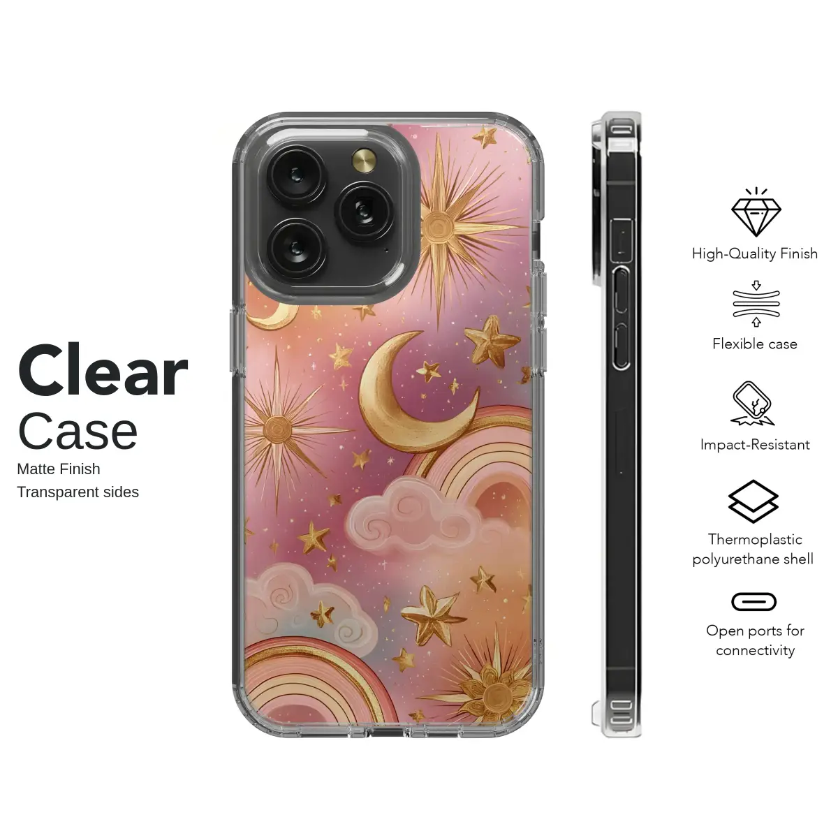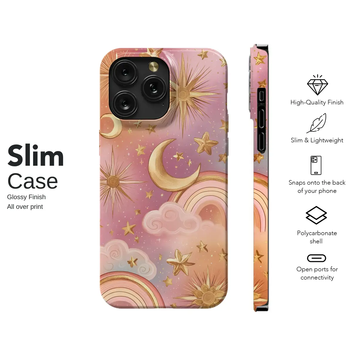Adorn your accessory with a touch of magic. This celestial design captures a dreamy, whimsical sky filled with shimmering gold moons, stars, and suns. Set against a beautiful pastel gradient of pink, purple, and orange, the artwork is complemented by soft clouds and subtle rainbows, creating an enchanting and mystical aesthetic.