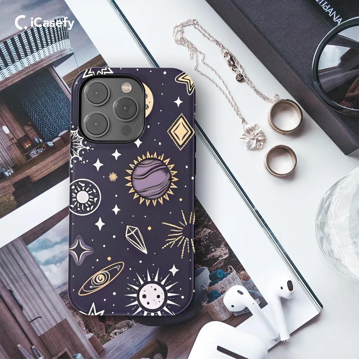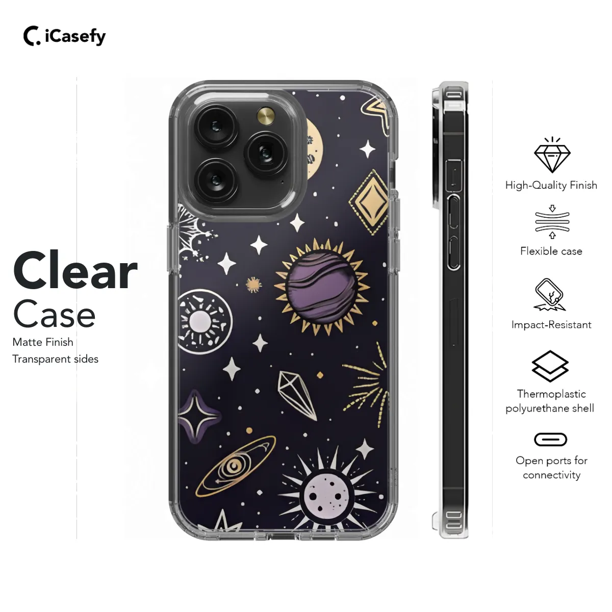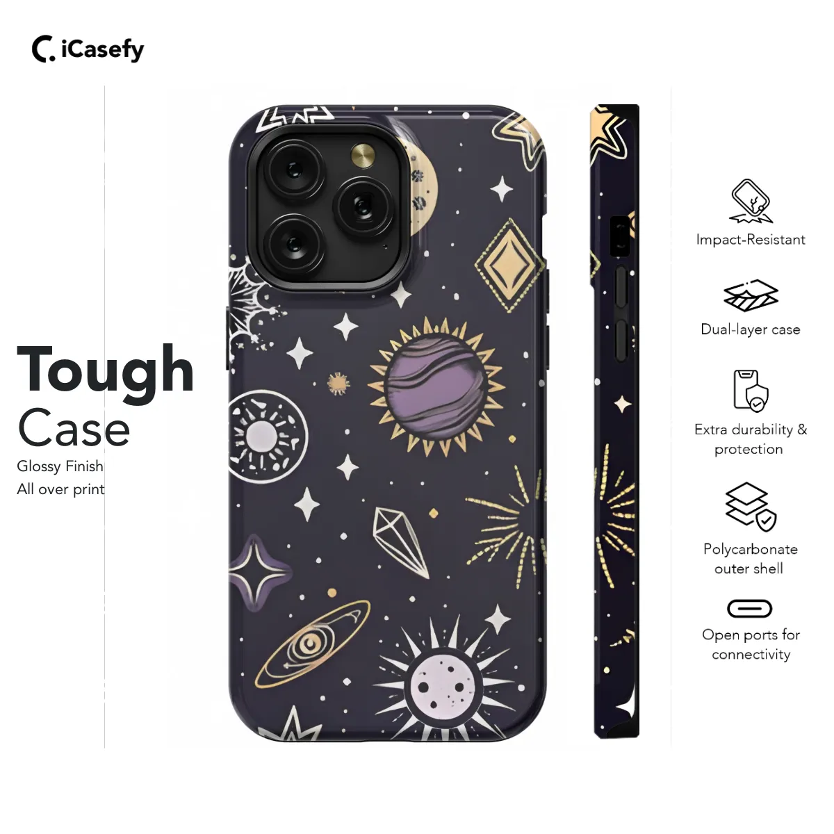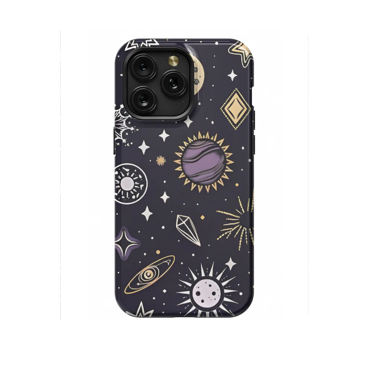 Immerse yourself in the celestial realm with our enchanting phone case, adorned with a mesmerizing tapestry of stars, moons, and planets. This ethereal accessory transports you to a cosmic dreamscape, where celestial bodies dance across your device. Protect your phone in style while embracing the boundless wonders of the cosmos.
