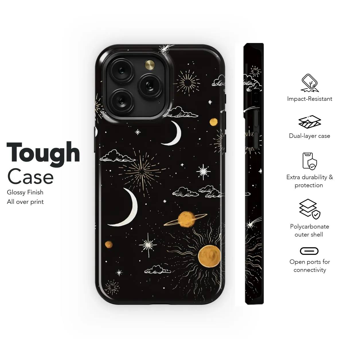 Carry the enchanting cosmos in the palm of your hand with this stunning celestial accessory, designed for those who dream with their eyes open. This intricate artwork captures a magical, hand-drawn starry night, a whimsical universe sprawling across a deep, velvety black canvas. Luminous golden planets, reminiscent of a serene Saturn, drift gracefully alongside shimmering, silvery crescent moons and a radiant, powerfully stylized sun that anchors the cosmic scene with its warm energy. Delicate, sketchy white clouds float dreamily among a beautiful scatter of twinkling stars, dazzling starbursts, and fleeting shooting stars, evoking a profound sense of wonder and infinite possibility. This design transforms your most essential daily companion into a personal talisman, a piece of wearable art that speaks to your soul and protects your portal to the world. The unique boho, doodle-art style lends an authentic, personal touch, making it a standout piece for anyone with a mystical or witchy aesthetic. Perfect for lovers of astrology, celestial events, and the timeless, mystical dance of the sun and moon, this beautiful shield is more than just a surface; it's a statement. It’s an ideal, thoughtful gift for her, a best friend, or any stargazer looking to carry a slice of the magical midnight sky with them on their daily journey. Let this beautiful celestial pattern guard your connection to the world while reflecting your inner universe.