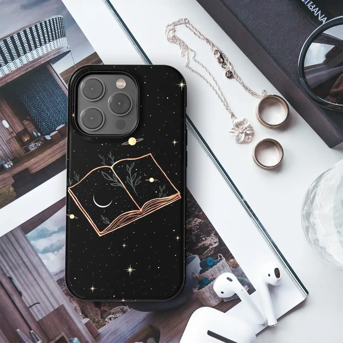 Carry a universe of stories in the palm of your hand with this enchanting celestial design, a true love letter to dreamers and bibliophiles. This isn't just an accessory; it's a portal. Imagine a mystical book, outlined in shimmering gold leaf, floating in the velvet darkness of deep space. As its pages open, they don't reveal words, but an entire galaxy—a breathtaking starry night sky spills forth, alive with twinkling constellations and distant, glowing planets. A serene crescent moon hangs nestled within the chapter, a quiet promise of magic and intuition, while tender green vines sprout from the binding, weaving a touch of earthy, cottagecore wonder into the cosmic scene. This design captures a perfect dark academia aesthetic, making it an unforgettable astrology gift for the stargazer or a treasured piece for any cosmic witch. It transforms your most essential tech into a personal talisman, a whimsical shield that protects your connection to the world while reflecting the universe within you. Let this beautiful moon and stars artwork be your daily companion, a constant, magical reminder that every story, and every soul, is written in the cosmos. It’s the perfect unique gift for the reader who has everything, a wearable piece of art that whispers of midnight libraries and celestial adventures.