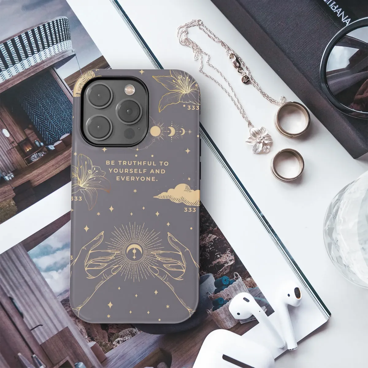 Adorn your device with this celestial design, featuring delicate lilies, celestial bodies, and the empowering message "Be truthful to yourself and everyone." The elegant gold accents against a deep navy backdrop create a sophisticated and mystical aesthetic. This design is perfect for those seeking a touch of spiritual inspiration and understated style. The repeating 333 motif adds a subtle layer of meaning, resonating with those familiar with angel numbers and their significance. This artistic print is a unique way to express your individuality and belief in authenticity. Embrace self-love and truth with this beautiful and meaningful accessory. High-quality printing ensures vibrant colors and lasting durability, protecting your device in style. This design is a perfect gift for yourself or someone special who appreciates mindfulness, spiritual growth, and stylish accessories. Elevate your everyday carry with this gorgeous, one-of-a-kind creation. Shop now and add a touch of celestial magic to your life.