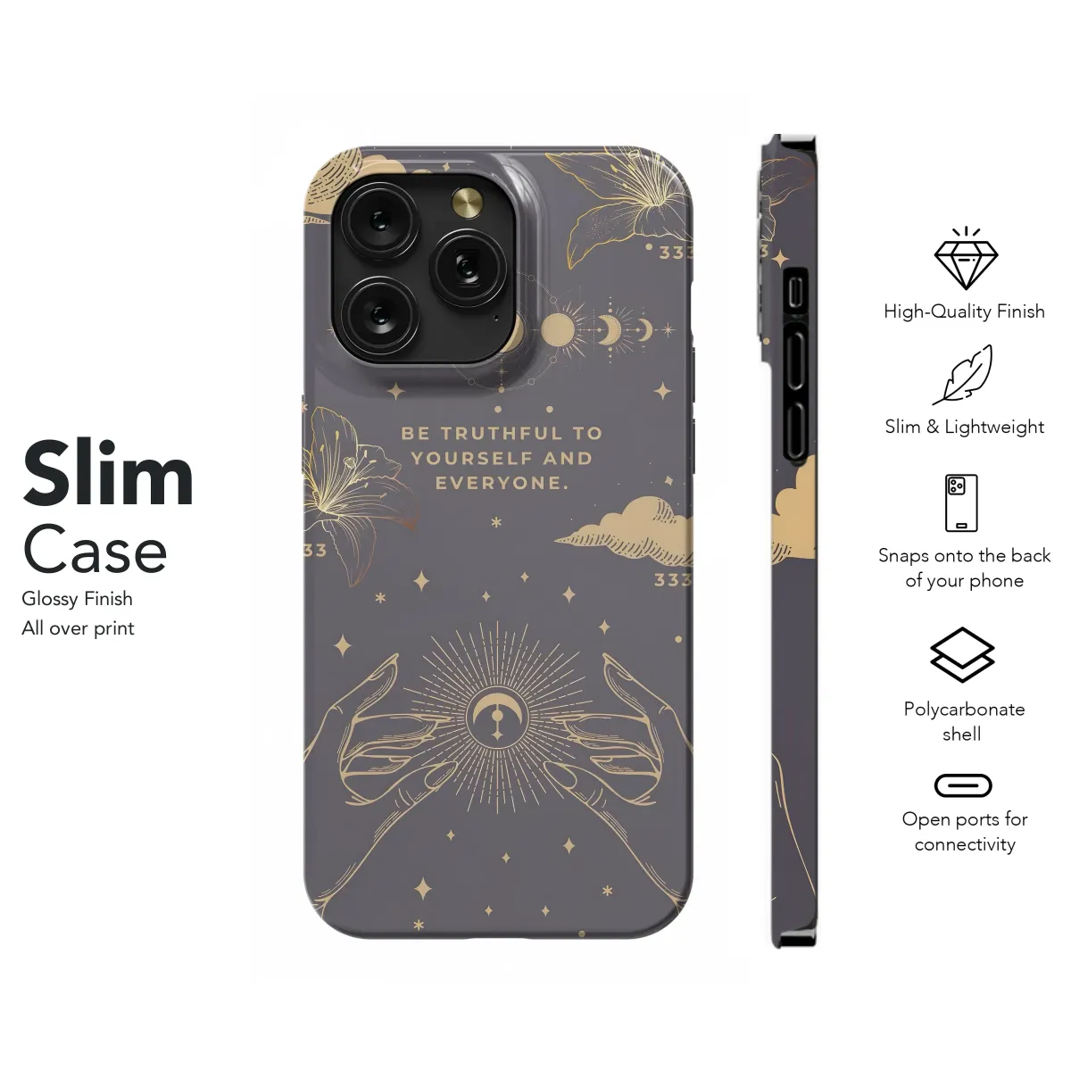 Adorn your device with this celestial design, featuring delicate lilies, celestial bodies, and the empowering message "Be truthful to yourself and everyone." The elegant gold accents against a deep navy backdrop create a sophisticated and mystical aesthetic. This design is perfect for those seeking a touch of spiritual inspiration and understated style. The repeating 333 motif adds a subtle layer of meaning, resonating with those familiar with angel numbers and their significance. This artistic print is a unique way to express your individuality and belief in authenticity. Embrace self-love and truth with this beautiful and meaningful accessory. High-quality printing ensures vibrant colors and lasting durability, protecting your device in style. This design is a perfect gift for yourself or someone special who appreciates mindfulness, spiritual growth, and stylish accessories. Elevate your everyday carry with this gorgeous, one-of-a-kind creation. Shop now and add a touch of celestial magic to your life.