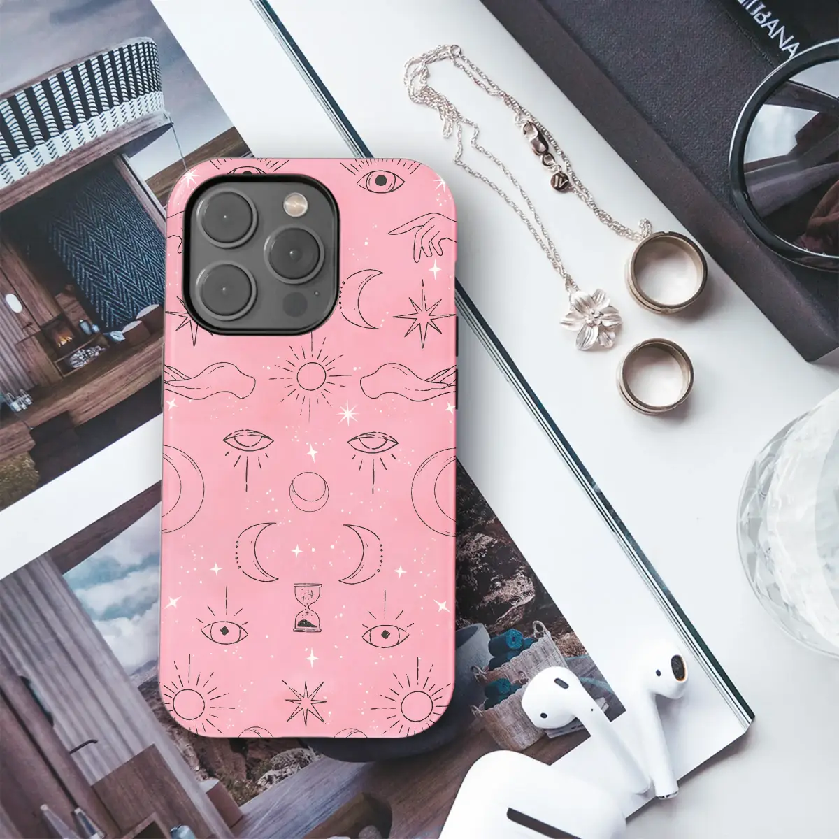 Embrace your inner mystic and adorn your daily tech companion with this enchanting celestial design. Set against a dreamy blush pink watercolor background, this intricate pattern is a cosmic tapestry of powerful spiritual symbols. Delicate, hand-drawn line art depicts the sacred phases of the moon, radiant suns, and twinkling stars, inviting the universe's magic into your everyday life. Gaze upon the all-seeing eyes offering protection and intuition, while graceful hands guide your path and hourglasses mark the sacred passage of time. This design is a perfect fusion of witchy aesthetic, boho charm, and a touch of Y2K nostalgia, making it an ideal accessory for anyone devoted to astrology, tarot, or their spiritual journey. More than just a stylish skin for your gadget, it acts as a personal talisman, a protective shield that reflects your unique soul. This cosmic artwork makes a thoughtful and magical gift for a best friend, sister, or any star-gazer in your life. Let this beautiful celestial guardian wrap your most-used device in its mystical energy, ensuring you carry a piece of the cosmos with you wherever you go, turning your essential gadget into a true statement of your spirit.