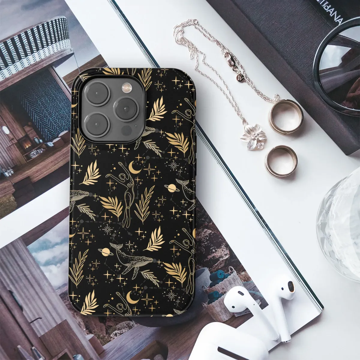 Dive into the depths of cosmic wonder with this celestial-inspired artwork, a mesmerizing blend of the mystical and the natural world. Delicate gold line art depicts graceful figures in motion, juxtaposed with majestic whales gliding through starry skies. Lush tropical foliage and crescent moons add an element of earthly paradise, while tiny planets and constellations hint at the vastness of the universe. The rich black backdrop enhances the ethereal glow of the golden details, creating a striking contrast that captivates the eye. Perfect for those who appreciate bohemian aesthetics, spiritual symbolism, or simply want to infuse their everyday carry with a touch of magic, this design offers a unique and stylish way to express your individuality. Let this enchanting piece bring a sense of harmony and connection to the cosmos wherever you go.