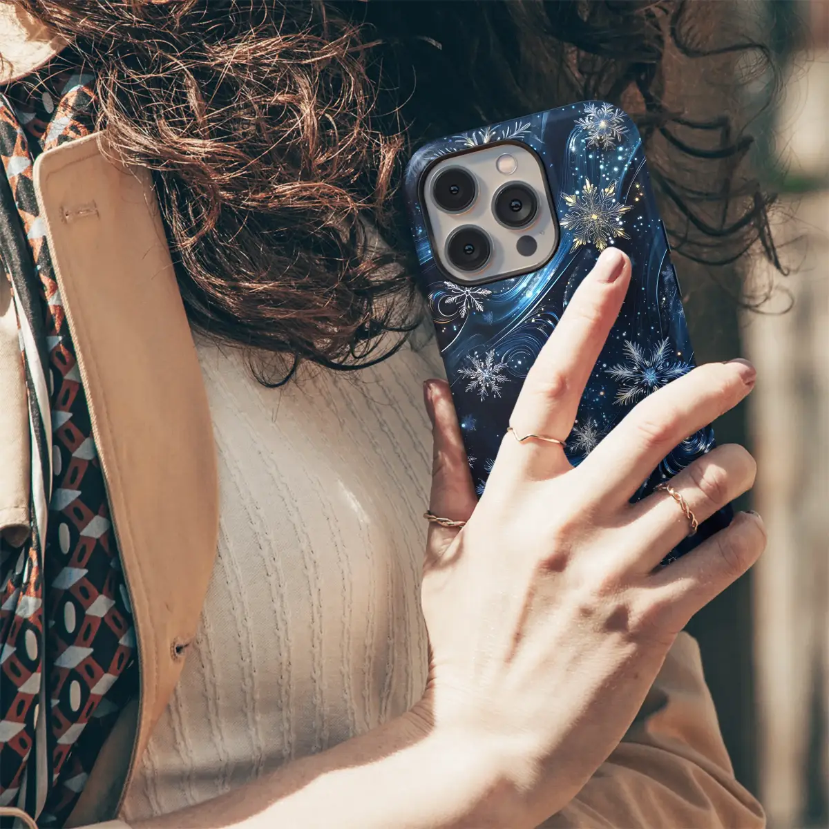 Embrace the magic of a winter night with this captivating celestial design. Intricate gold and silver snowflakes drift gracefully through a deep blue cosmos, highlighted by luminous, swirling ribbons of light. This elegant pattern captures the enchanting beauty of a starry, frozen galaxy, perfect for anyone who loves a touch of winter wonder.