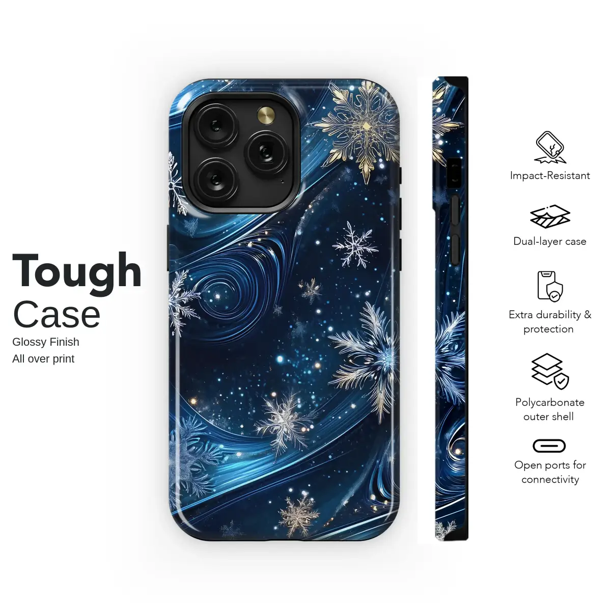 Embrace the magic of a winter night with this captivating celestial design. Intricate gold and silver snowflakes drift gracefully through a deep blue cosmos, highlighted by luminous, swirling ribbons of light. This elegant pattern captures the enchanting beauty of a starry, frozen galaxy, perfect for anyone who loves a touch of winter wonder.