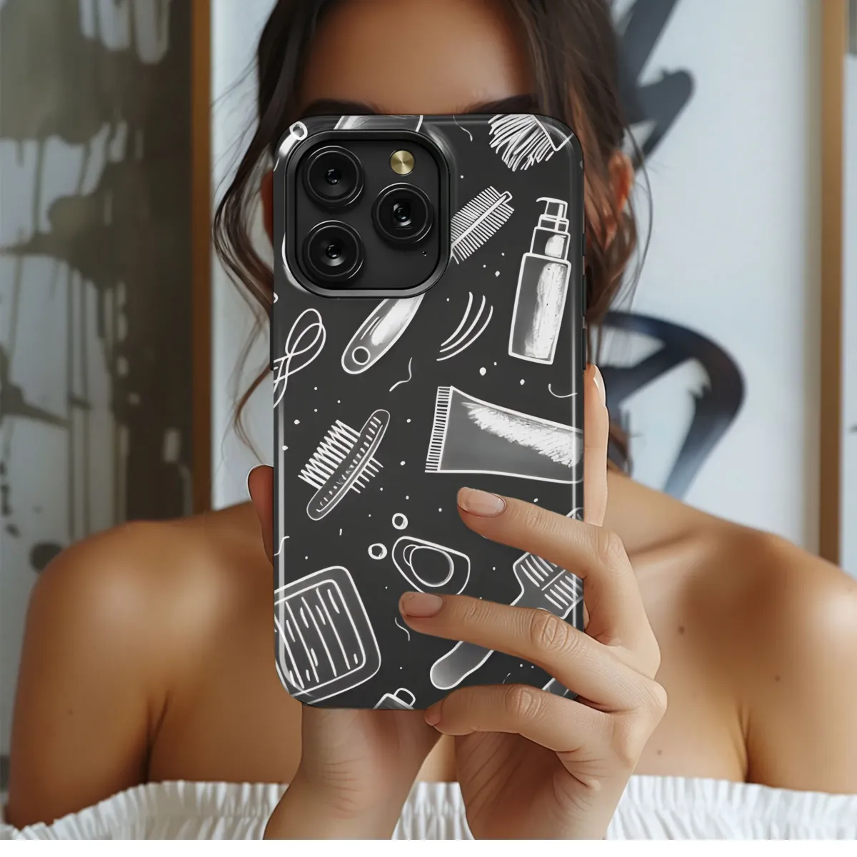 Adorn your device with this chic and stylish accessory, showcasing a unique hand-drawn, chalkboard-style design. This striking pattern features an array of artistic cosmetic and grooming implements: various brushes, elegant combs, sleek tubes, and delicate tweezers are carefully arranged against a dark backdrop, offering a touch of salon-inspired sophistication. Perfect for the beauty enthusiast, makeup artist, hairdresser, or anyone who appreciates a touch of handcrafted charm, this design adds a personalized and fashionable flair to your everyday tech. Make a statement and protect your device with this durable and visually appealing piece of art. Keywords: beauty, cosmetics, grooming, salon, hairdresser, makeup artist, chalkboard, hand-drawn, pattern, accessory, stylish, chic, art, brushes, combs, tweezers.