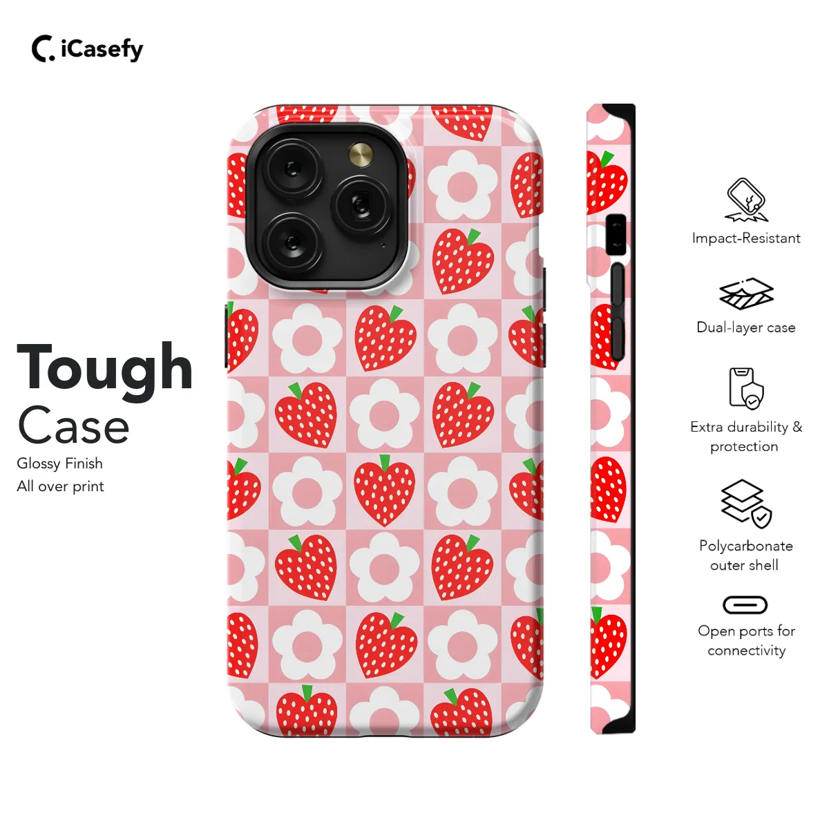 Step into a world of playful charm with our Checkered Daisy Strawberry Phone Case! This adorable case features a vibrant pink and white checkered pattern adorned with the cutest little strawberries. Its slim profile fits snugly around your iPhone, Samsung, Pixel, or other compatible device, offering stylish protection. The soft-touch TPU material provides a comfortable grip, while the raised edges safeguard your precious screen from scratches and drops. Transform your phone into a fashionable statement piece with our Checkered Daisy Strawberry Phone Case today!