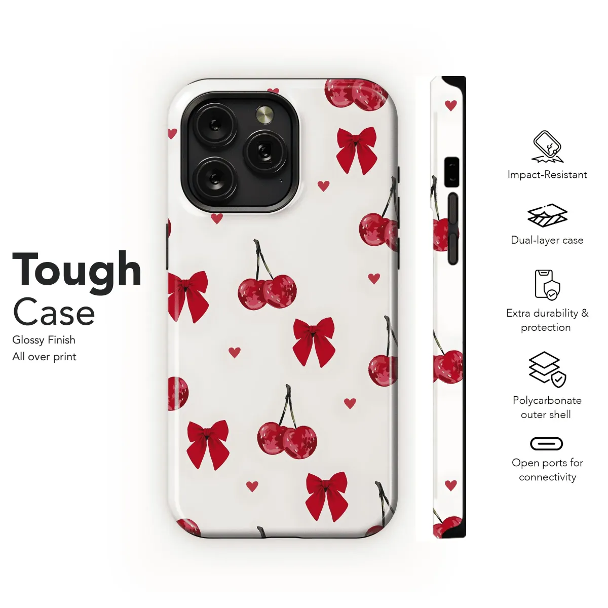 Sweeten your tech with this cherries and bows phone case! Adorable pattern for iPhone, Samsung, and Pixel models 4, 5, 2, and 7.