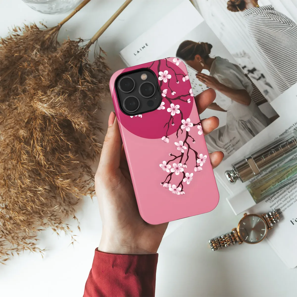 Adorn your device with this elegant cherry blossom design. This stunning artwork features delicate pink blossoms gracefully arranged against a vibrant crimson sun, creating a captivating minimalist aesthetic. The intricate detailing of the branches and flowers adds a touch of sophistication, making this a perfect accessory for those who appreciate beauty and understated elegance. This design is printed using high-quality inks ensuring vibrant colors that will last. Its perfect size showcases the artwork beautifully while remaining practical and easy to apply. Bring a touch of springtime beauty to your everyday life with this unique and charming design. This makes a thoughtful gift for yourself or a loved one. Choose this design for a personalized touch that reflects your style. This beautiful floral design is sure to turn heads and complement your unique personality. The high-resolution print provides sharp, detailed imagery. Upgrade your look with this stylish design and enhance your personal aesthetic. #cherryblossom #floraldesign #minimalist #pink #spring #beautiful #elegant #stylish #personalized #gift.