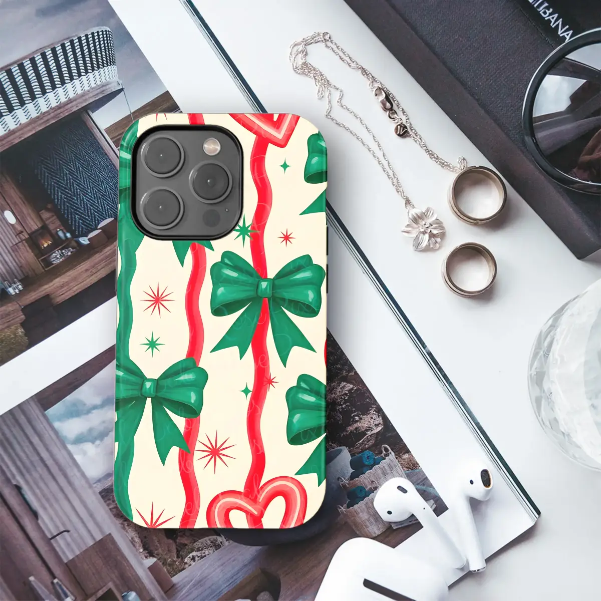 Wrap your device in holiday cheer with this festive design. This charming pattern features vibrant green satin bows, whimsical red and white candy cane hearts, and sparkling stars against a warm cream background. Playful red and green ribbons create a sense of joyful movement, making it an eye-catching choice for the Christmas season.