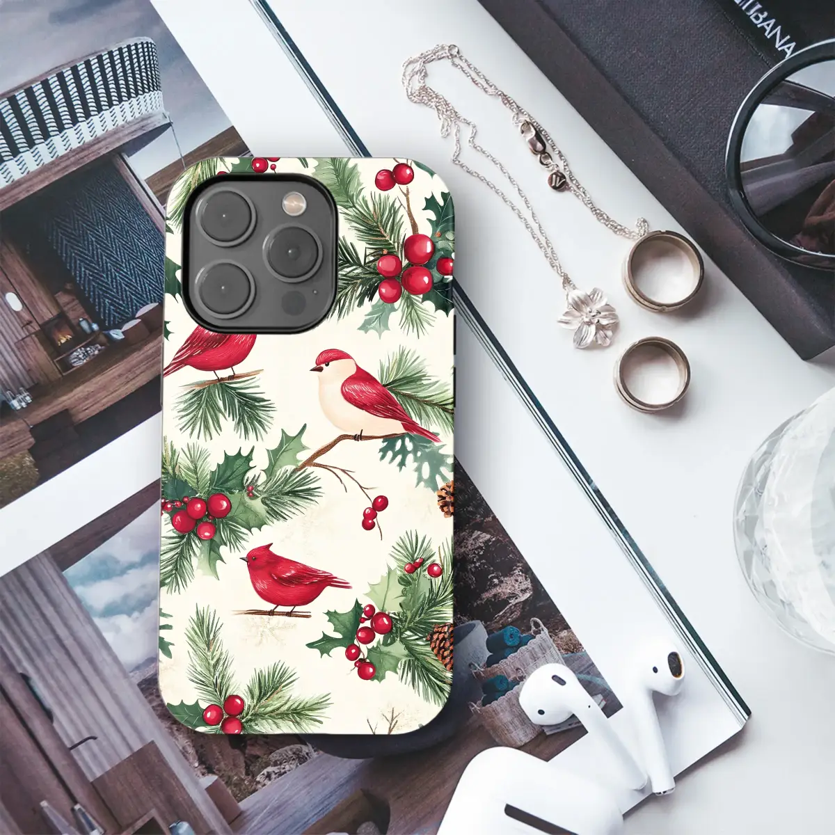 Embrace the festive season with this charming winter wonderland design. This beautiful pattern features vibrant red cardinals perched among lush green pine branches, festive holly leaves, and bright red berries. Accented with rustic pinecones and a sparkling red ornament, this artwork captures the cozy and joyful spirit of Christmas.