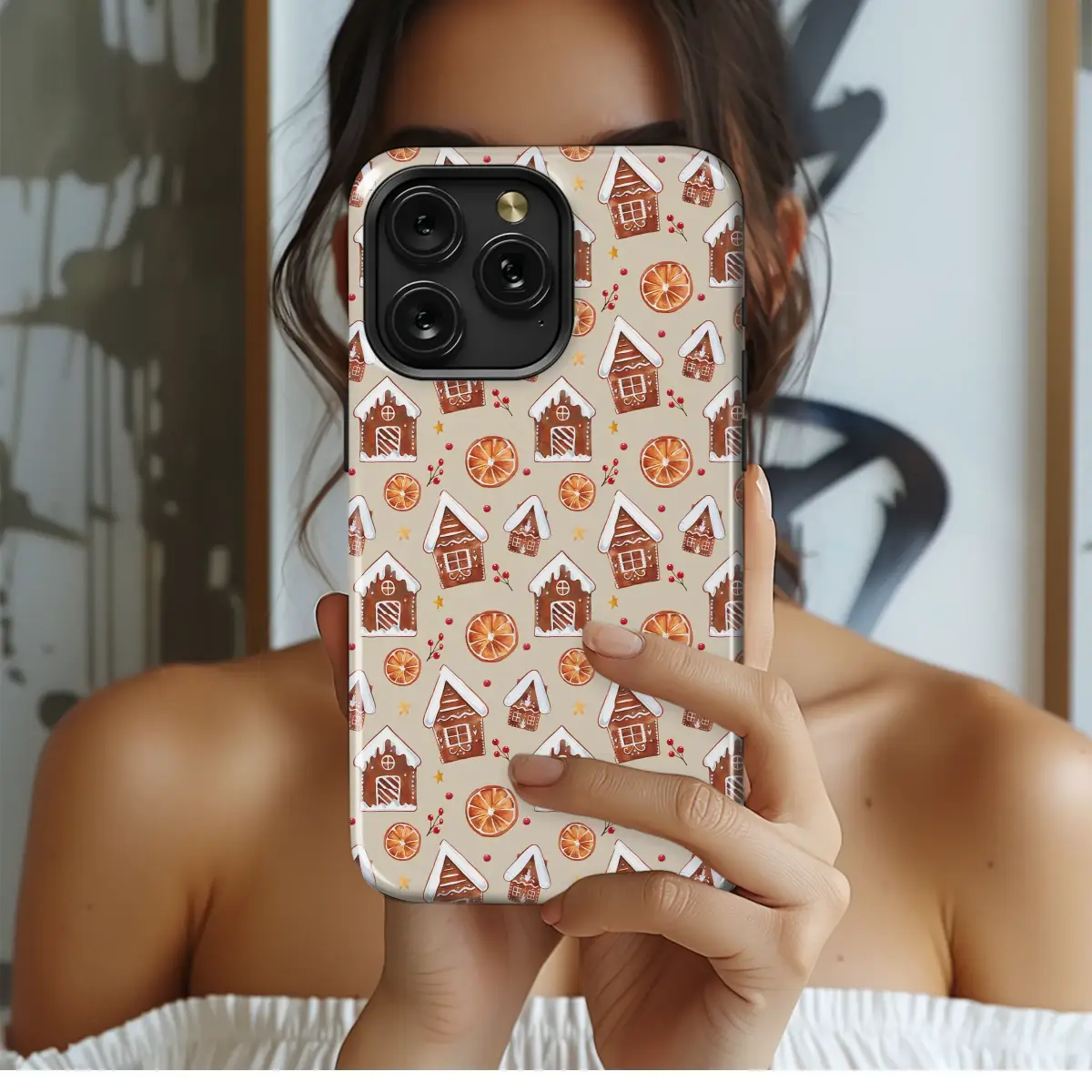 Embrace the festive spirit with this charming holiday pattern. This design features beautifully detailed watercolor gingerbread houses, complete with snow-dusted roofs and intricate icing. Interspersed between the cozy cookie homes are slices of dried orange, sprigs of vibrant red berries, and tiny golden stars, all set against a warm, neutral background to capture the magic of the Christmas season.