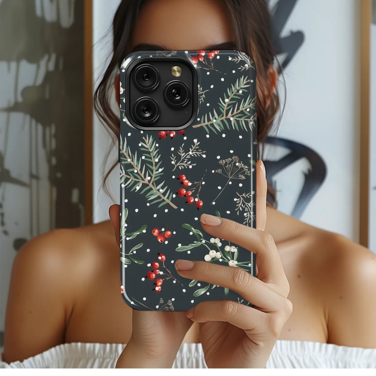 **Celebrate the magic of Christmas with our enchanting seamless mistletoe phone case.** Adorned with a festive pattern of mistletoe and swirling designs, this case will bring Christmas cheer to your smartphone all season long. Available for a wide range of iPhone, Samsung, and Pixel models, it's the perfect way to protect your device while expressing your holiday spirit. Crafted from durable materials, our phone case provides reliable protection against scratches, bumps, and drops. The precise cutouts ensure easy access to all buttons and ports, so you can use your phone without any hassle. Give the gift of holiday cheer to yourself or a loved one with our Christmas Seamless Pattern Mistletoe Phone Case. It's the perfect stocking stuffer or secret Santa gift that will spread joy throughout the season.
