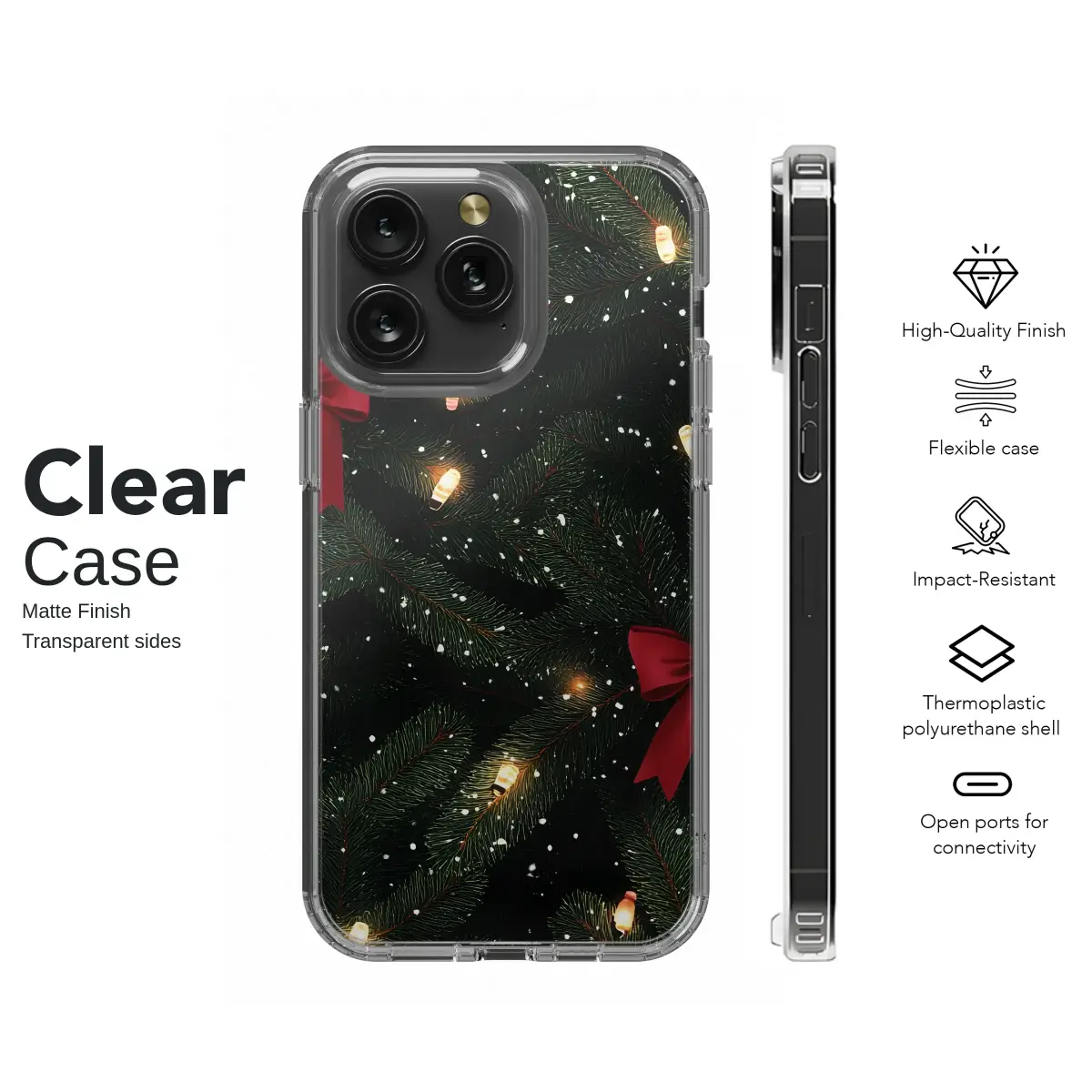 Embrace the holiday spirit with this festive design featuring a classic Christmas tree. The pattern showcases lush green pine branches adorned with glowing twinkle lights, delicate snowfall, and charming red satin bows for a warm, traditional feel.