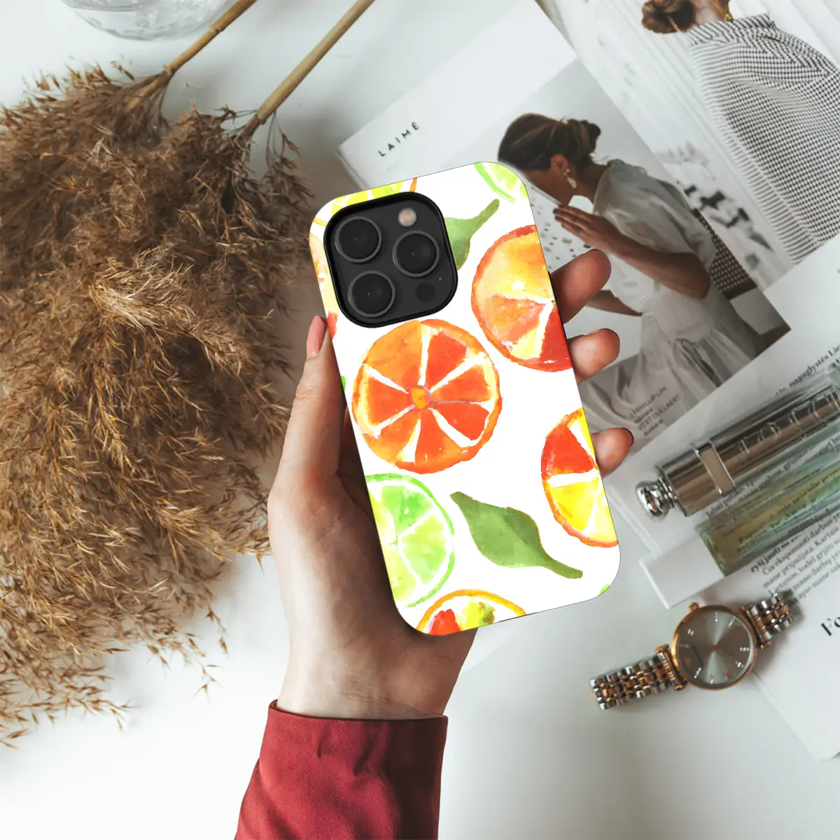 Indulge in a burst of freshness with our vibrant Citrus Watercolor Phone Case. Featuring an eye-catching watercolor print of zesty citrus fruits, this case transforms your phone into a canvas of summery charm. Its lightweight and flexible design effortlessly shields your device from bumps and scratches, while providing a secure and comfortable grip. Available for iPhone, Samsung, and Pixel devices, this case is the perfect accessory to brighten up your phone and add a touch of playful elegance to your everyday style.