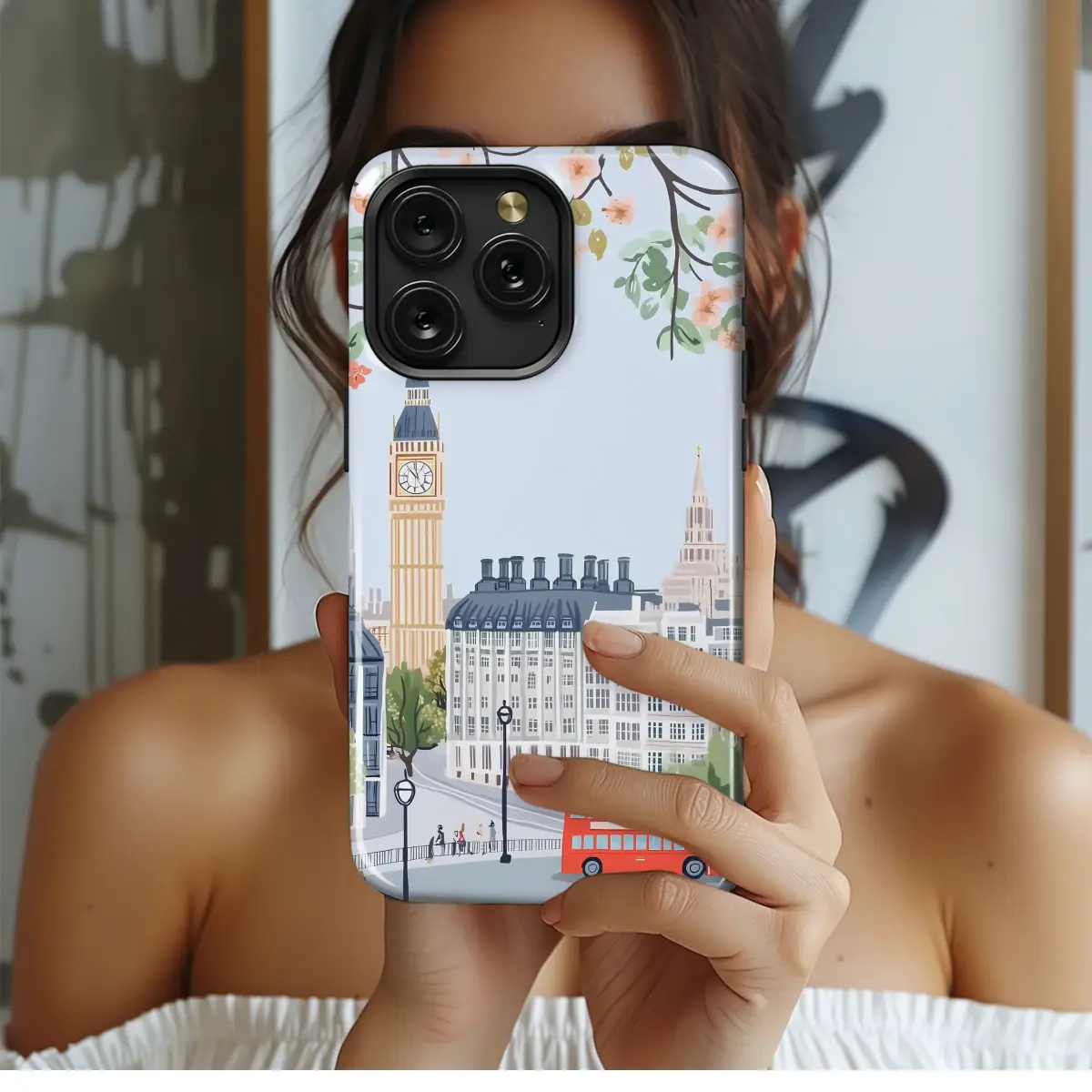 Escape to a dreamy London afternoon every time you reach for your device with this enchanting artistic design. Let your imagination wander through cobblestone streets as delicate cherry blossoms in soft blush and coral hues gracefully frame a picturesque city view. Below the canopy of spring, the iconic Big Ben stands proudly against a serene powder-blue sky, its chimes almost audible. A classic red double-decker bus adds a cheerful pop of color, navigating the charming avenue lined with detailed Georgian architecture in elegant shades of slate blue and cream. This whimsical, painterly illustration captures the heart of England with a touch of light academia and cottagecore charm, making it a perfect piece of pocket-sized wanderlust. It’s more than just a beautiful accessory for your most essential tech; it’s a daily portal to a romantic European adventure. An ideal gift for the travel lover, the dedicated Anglophile, or anyone who finds magic in the bustling, beautiful streets of London, this unique cityscape artwork will protect your connection to the world while wrapping it in a storybook scene.