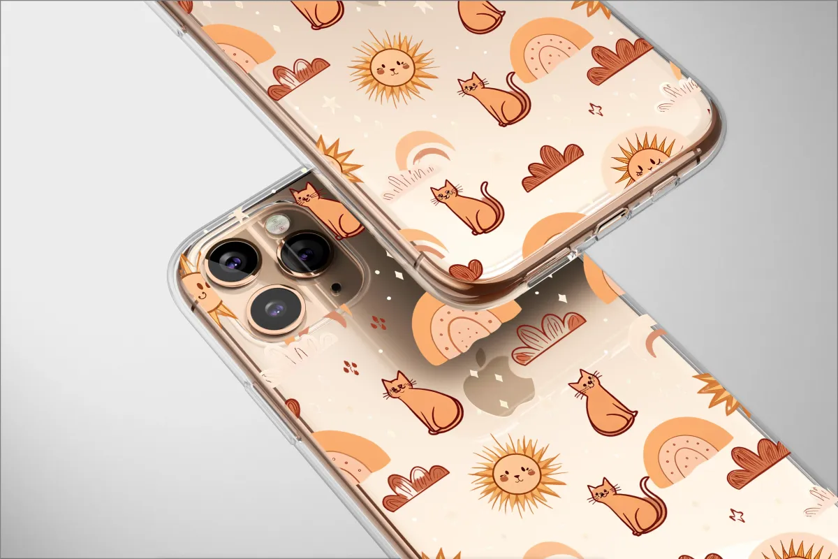Wrap your most essential accessory in a celestial dreamscape with this enchanting artwork. Step into a whimsical midnight world where cozy, ginger cats sit peacefully beneath a sky sprinkled with twinkling stars, guarding the secrets of the cosmos. Friendly, smiling suns cast a warm, gentle glow, sharing the night with earthy, terracotta rainbows that arch over soft, dreamy clouds. This captivating pattern, set against a deep black canvas, beautifully merges a boho aesthetic with celestial wonder, weaving a truly magical visual story for your daily companion. Each element, from the charmingly pixelated stars to the contented smirk on each feline friend, is crafted to spark joy and inspire a sense of cozy magic. This design is a celebration of warm, earthy tones and mystic charm, making it an ideal gift for the daydreamer, the devoted cat lover, or the soul who finds profound beauty in the night sky. Let this unique illustration be a daily reminder of warmth, whimsy, and the quiet magic that surrounds us, transforming an everyday item into a personal portal to a starlit wonderland. Carry a piece of this mystical universe with you, a protective talisman that not only safeguards your connection to the world but also expresses your unique, artistic spirit and love for all things magical and serene.