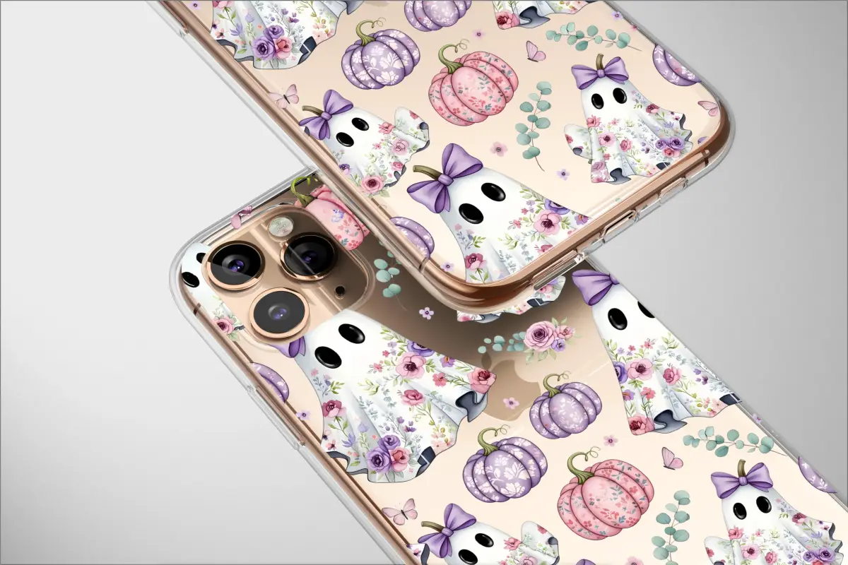Embrace the magic of a whimsical autumn with this enchanting design, where spooky season meets cottagecore charm in a delightful visual symphony. Imagine floating through a dreamy, moonlit garden filled with the friendliest little ghosts, each one uniquely adorned in delicate watercolor florals of soft pink and lavender roses, their spectral forms billowing like fine silk. They playfully dance among intricately patterned pastel pumpkins, some blushing in rosy pinks with tiny blossoms, others serene in shades of lilac with elegant damask prints. Gentle butterflies with translucent wings flutter through sprigs of eucalyptus, adding a touch of ethereal life to the scene. This isn't your typical Halloween art; it's a heartfelt celebration of the 'spooky cute' style, beautifully blending the cozy nostalgia of fall with a soft, romantic aesthetic. The carefully curated palette of muted purples, dusty rose, and sage greens creates a serene yet playful atmosphere, perfect for anyone who loves a touch of everyday magic. It's an ideal piece for those who believe that even the ghostly can be graceful and that autumn can be both haunting and heartwarming. Wrap your daily essentials in this unique, botanical-inspired pattern and carry a piece of sweet, spectral elegance with you, making every day feel like an enchanted trip to a secret pumpkin patch.
