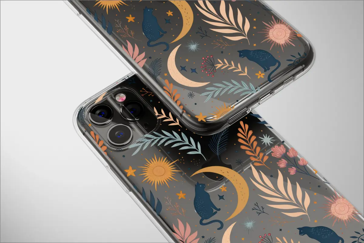 Immerse yourself in a celestial dreamscape where the cosmos weaves through a hidden midnight garden. This enchanting design is a love letter to the magical moments after dusk, capturing serene feline silhouettes as they gaze out from golden crescent moons, their forms a deep and mysterious indigo. All around them, a universe unfolds in a rich, earthy palette; radiant folk-art suns in terracotta and gold share the sky with a constellation of twinkling stars and whimsical floral bursts of soft blush pink. A lush tapestry of stylized botanicals—delicate ferns, sprawling leaves, and mysterious berries—creates a stunning contrast against the profound black canvas, evoking a sense of ancient wonder and bohemian charm. The slightly textured, illustrative style lends a tactile, handcrafted feel, making each detail feel personal and unique. This artwork is for the soul that thrives in the moonlight, for the lover of mystical tales and cosmic beauty. Adorn your most essential accessory with this celestial pattern and carry a piece of the enchanted night with you. It’s not just a beautiful design; it’s a personal talisman, a quiet statement of your connection to the magic that exists in the stars and the wild, whispering gardens of the earth.