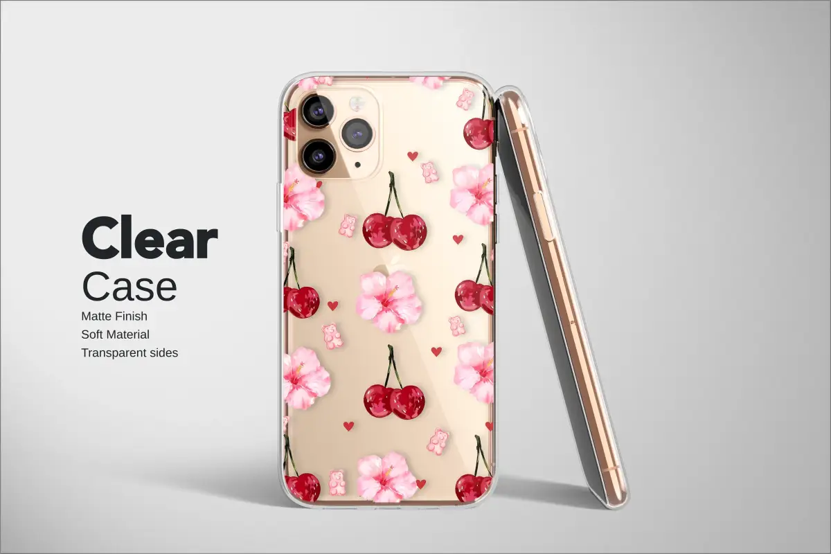 Embrace a vibe that's part sweet nostalgia and part moody romance with this captivating design, a perfect aesthetic for your daily companion. Picture a canvas of deepest night where glossy, candy-apple red cherries glisten with an almost edible sheen, their vibrant color a bold statement against the dark background. Floating delicately between them are soft, watercolor hibiscus flowers in dreamy shades of blush pink, offering a gentle, tropical contrast. For a touch of pure fun, adorable pink gummy bears are scattered throughout—a whimsical nod to Y2K charm and sweet treats—while tiny red hearts add a hint of coquette romance. This dark floral pattern transforms your most essential tech into a piece of wearable art, wrapping it in a layer of style that's both edgy and irresistibly cute. It’s the perfect accessory for anyone who adores a unique aesthetic, blending dark cottagecore with kawaii elements. An ideal gift for her or a treat for yourself, this cherry and flower design lets you carry a little piece of happiness everywhere, protecting your connection to the world with personality and flair.