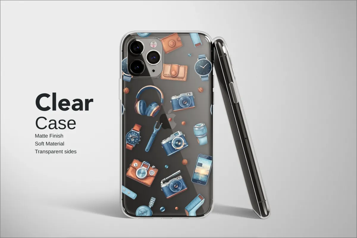 Wrap your favorite tech in the spirit of timeless sophistication with this stunningly detailed design, a masterpiece of classic illustration. A tribute to the modern gentleman's everyday carry, this artwork captures a curated collection of iconic essentials, each piece rendered with artistic flair and a touch of vintage charm. Discover elegant timepieces with minimalist faces and intricate chronographs, their metallic sheen glinting against the deep backdrop. Vintage-style cameras, reminiscent of analog adventures, are ready to capture life's fleeting moments, while supple leather wallets speak of heritage and journeys taken. Sleek, modern headphones float alongside classic pens and finely crafted tools, creating a dynamic collage of passions, hobbies, and pursuits. The rich, masculine palette of deep navy blues, warm cognac leather, and cool metallic silvers pops against a bold, striped black background, creating a compelling visual narrative of style, substance, and preparedness. This isn't just a pattern; it's a statement for the discerning individual who appreciates fine craftsmanship and iconic design. Let this unique, sophisticated art piece elevate your daily gear, adding a layer of classic charm and personal story to your most-used accessory.