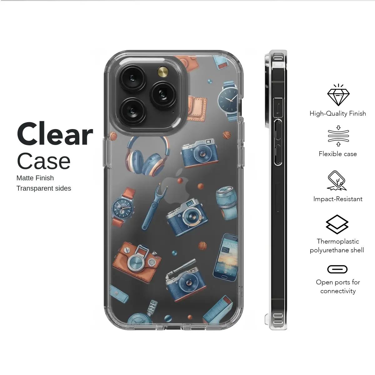 Wrap your favorite tech in the spirit of timeless sophistication with this stunningly detailed design, a masterpiece of classic illustration. A tribute to the modern gentleman's everyday carry, this artwork captures a curated collection of iconic essentials, each piece rendered with artistic flair and a touch of vintage charm. Discover elegant timepieces with minimalist faces and intricate chronographs, their metallic sheen glinting against the deep backdrop. Vintage-style cameras, reminiscent of analog adventures, are ready to capture life's fleeting moments, while supple leather wallets speak of heritage and journeys taken. Sleek, modern headphones float alongside classic pens and finely crafted tools, creating a dynamic collage of passions, hobbies, and pursuits. The rich, masculine palette of deep navy blues, warm cognac leather, and cool metallic silvers pops against a bold, striped black background, creating a compelling visual narrative of style, substance, and preparedness. This isn't just a pattern; it's a statement for the discerning individual who appreciates fine craftsmanship and iconic design. Let this unique, sophisticated art piece elevate your daily gear, adding a layer of classic charm and personal story to your most-used accessory.