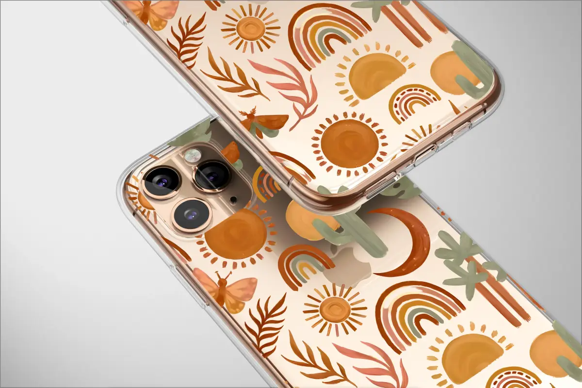 Embrace a unique fusion of nature and digital art with this captivating design. The pattern features a warm, bohemian desert landscape brought to life with earthy tones and whimsical elements. Discover stylized terracotta suns, muted green cacti, abstract rainbows, and delicate butterflies set against a vibrant, pixelated background. The intentional 'glitch' effect introduces a modern, tech-inspired twist to the classic boho aesthetic, creating a truly eye-catching piece.