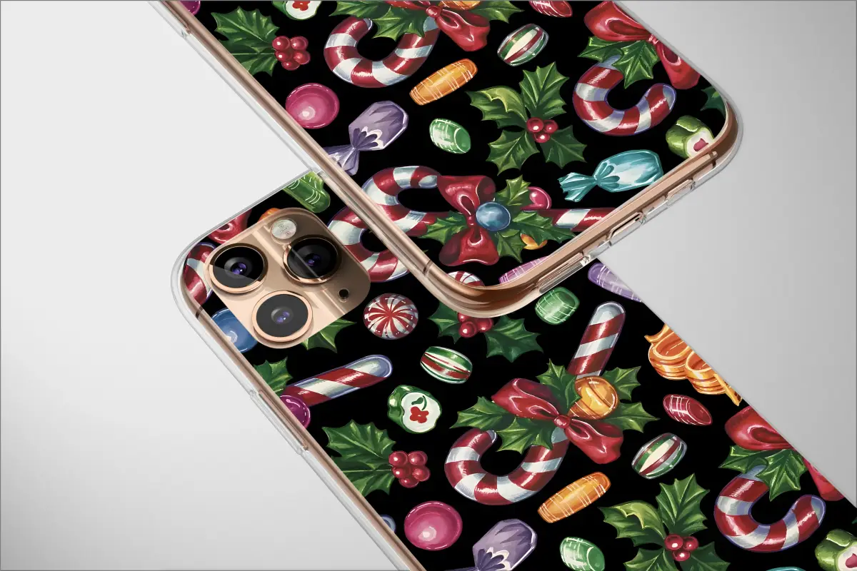Embrace the holiday spirit with this vibrant and festive design. This unique pattern features a delightful assortment of classic Christmas candies, including cheerful red-and-white striped candy canes, bright holly berries with green leaves, and a variety of colorful wrapped sweets. The traditional watercolor illustrations are set against a modern, dynamic background with a subtle glitch effect, creating a playful and eye-catching contrast for a truly unique holiday look.