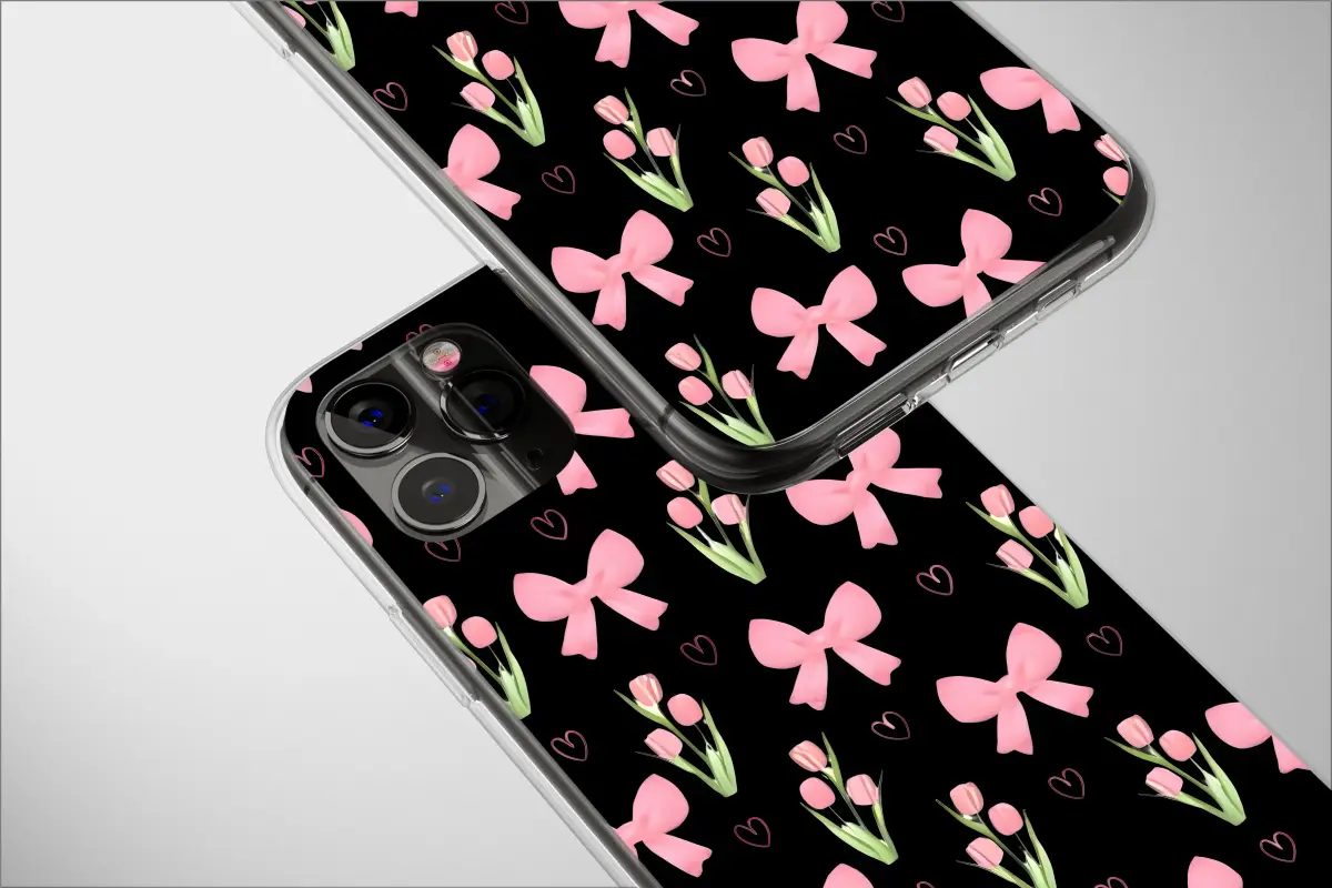 Embrace the coquette aesthetic with this romantic pattern featuring soft pink bows, delicate tulips, and charming hearts. This design blends classic girly elements with a modern twist, set against a unique black and white glitch-striped background for a touch of Y2K-inspired edge.