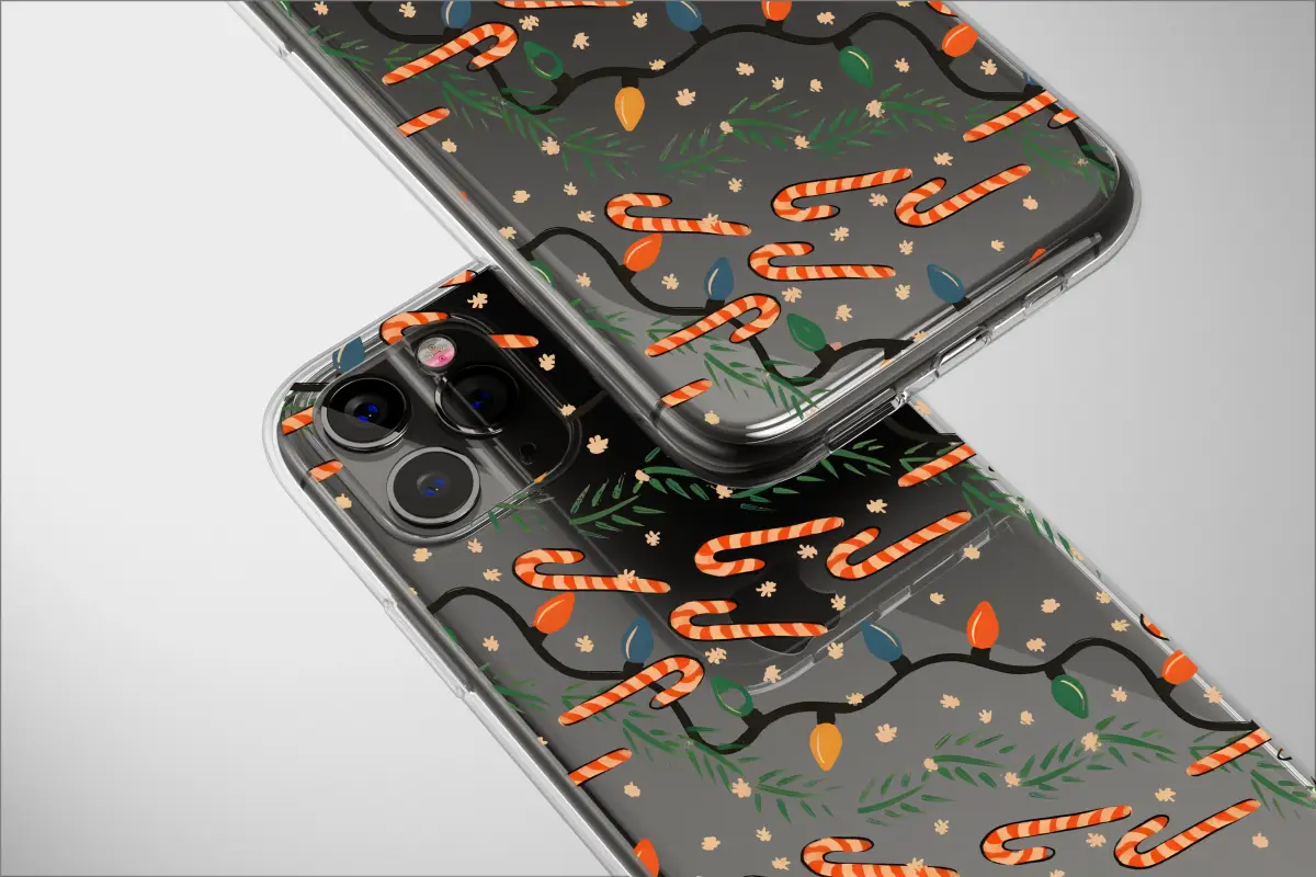 Celebrate the holiday season with this festive Christmas pattern. This charming design features classic candy canes, strings of colorful holiday lights, and fresh pine branches set against a dark background. The whimsical, illustrated style adds a cozy and cheerful touch, perfect for anyone who loves the magic of Christmas.