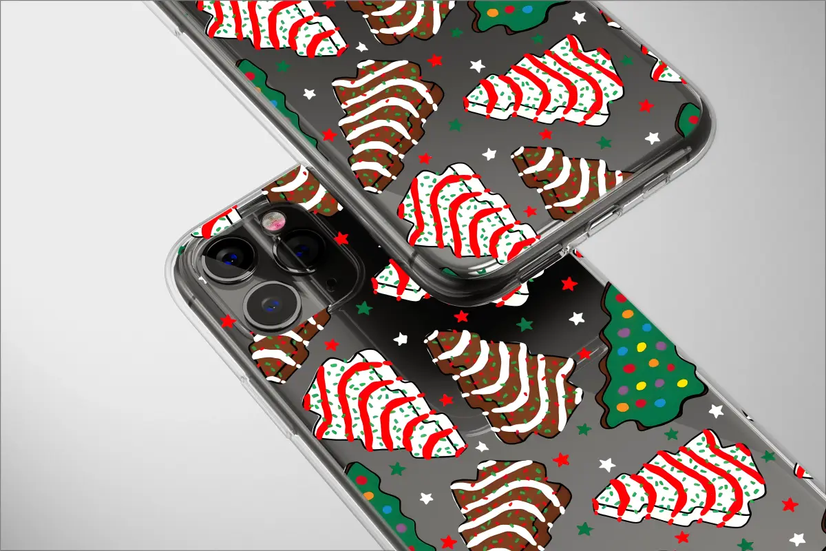Embrace the holiday season with this unique and vibrant design. A playful pattern of frosted Christmas tree cookies, complete with colorful sprinkles and sweet icing, tumbles against a modern, abstract background. The dynamic glitch effect in festive red, green, and white adds an artistic and edgy twist to the classic holiday treat motif, making it a standout piece for your celebrations.