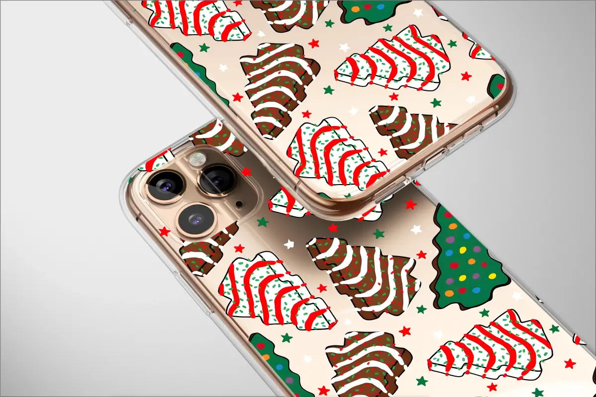 Embrace the holiday season with this unique and vibrant design. A playful pattern of frosted Christmas tree cookies, complete with colorful sprinkles and sweet icing, tumbles against a modern, abstract background. The dynamic glitch effect in festive red, green, and white adds an artistic and edgy twist to the classic holiday treat motif, making it a standout piece for your celebrations.