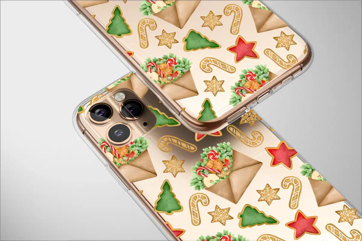Celebrate the holidays with a unique blend of classic and modern aesthetics. This festive design features a charming pattern of watercolor-style gingerbread cookies, candy canes, and envelopes filled with sweet treats. The traditional holiday elements are set against a vibrant, pixelated glitch art background, creating a playful and eye-catching look.